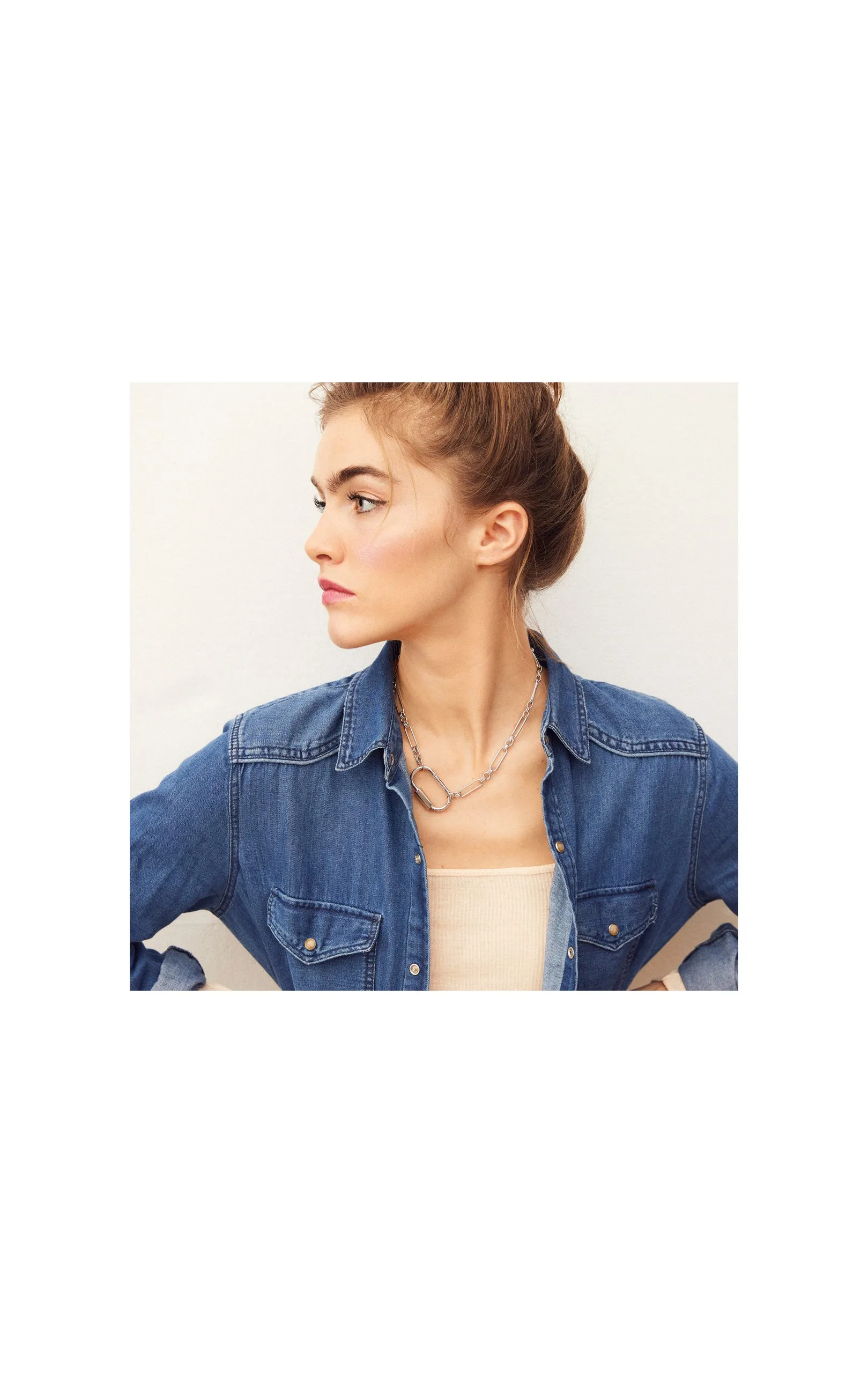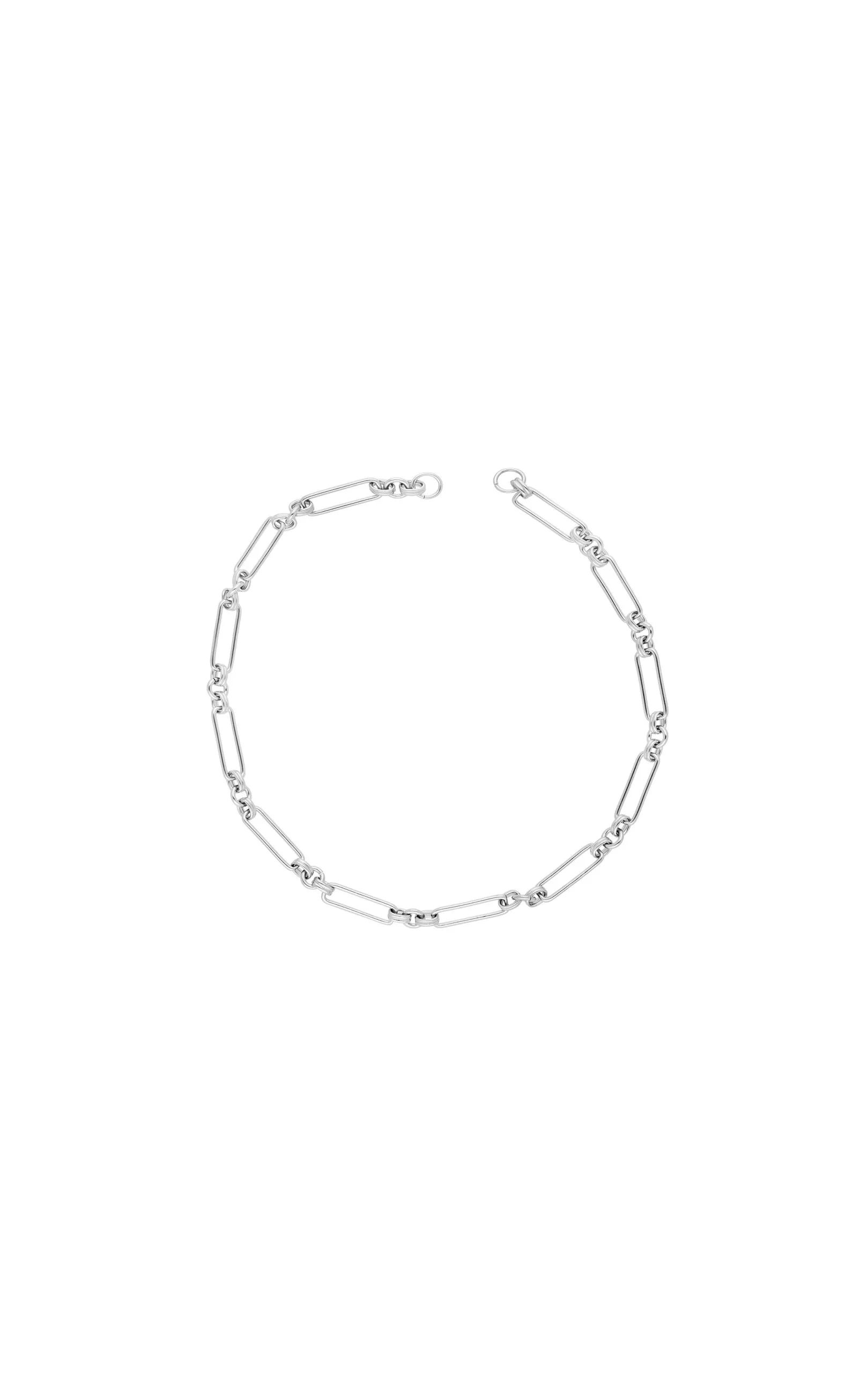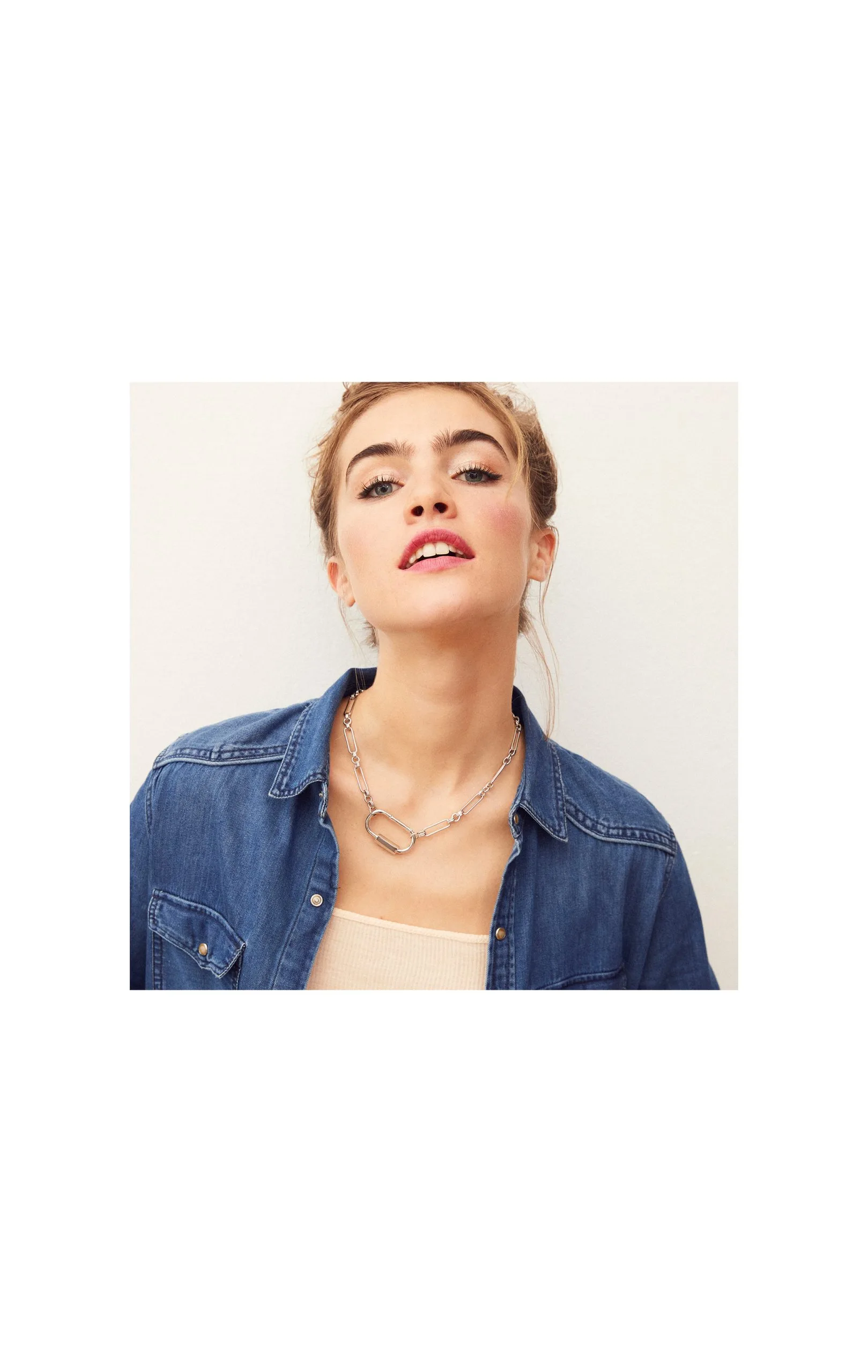 Les colliers « CARAVELLE » sont les liens en chaîne. Ici vous est présentée une chaîne argentée à grand maillons rectangulaires s’alternant avec des maillons triple-anneaux pour un look très mode. À associer avec les fermoirs « LOCKETS ».