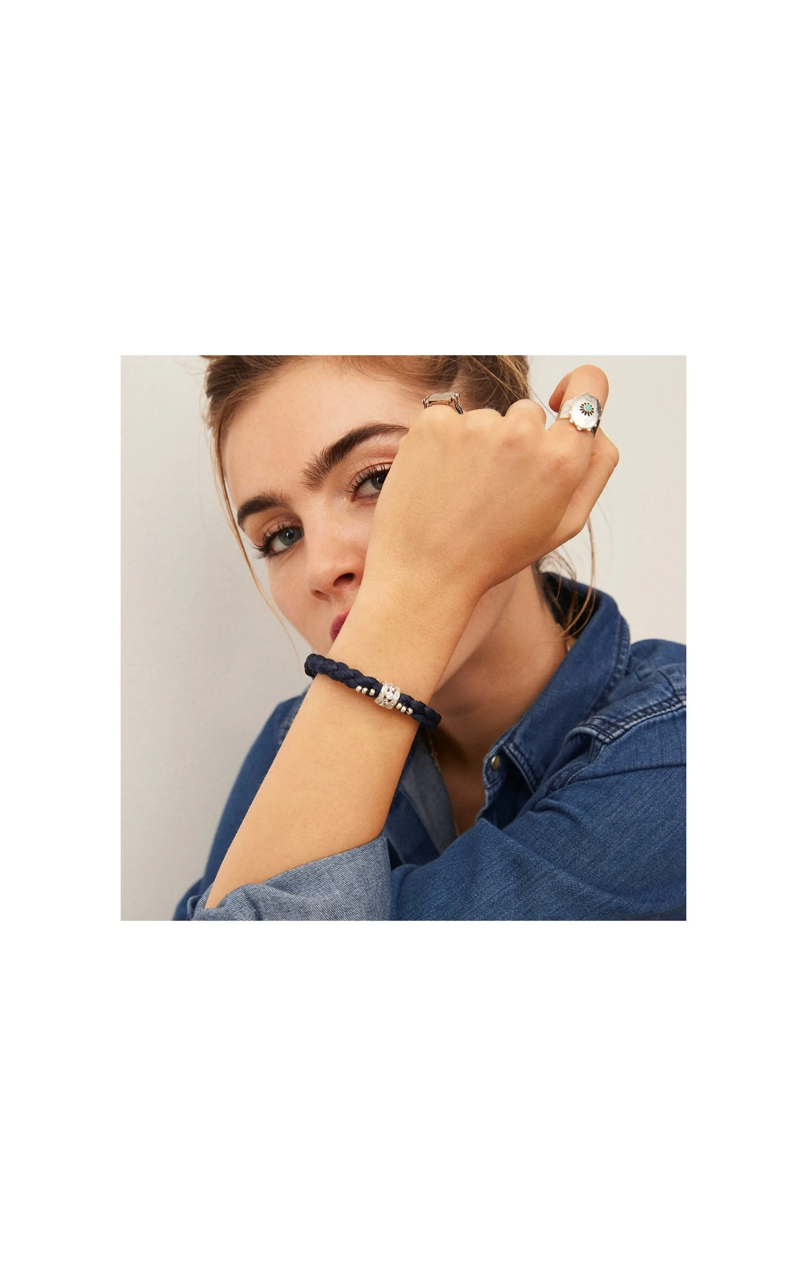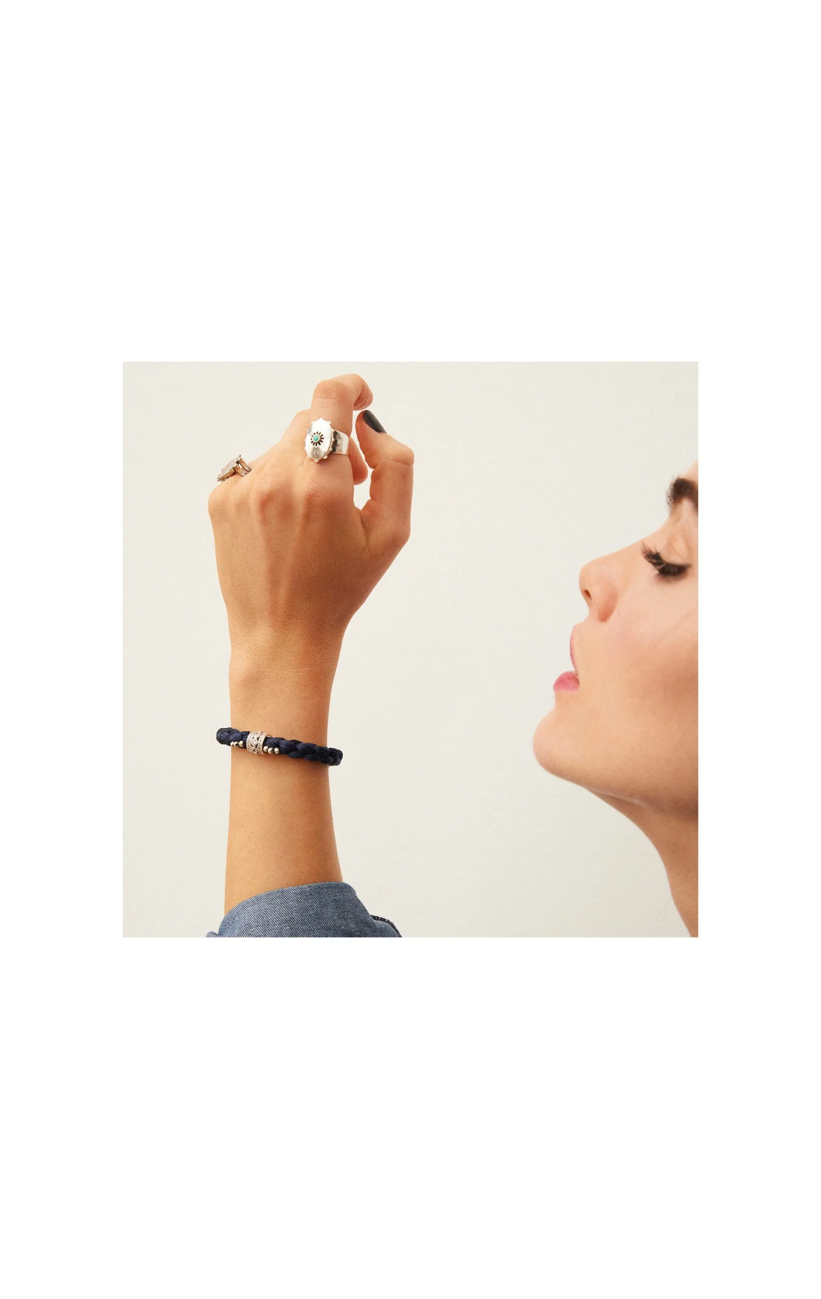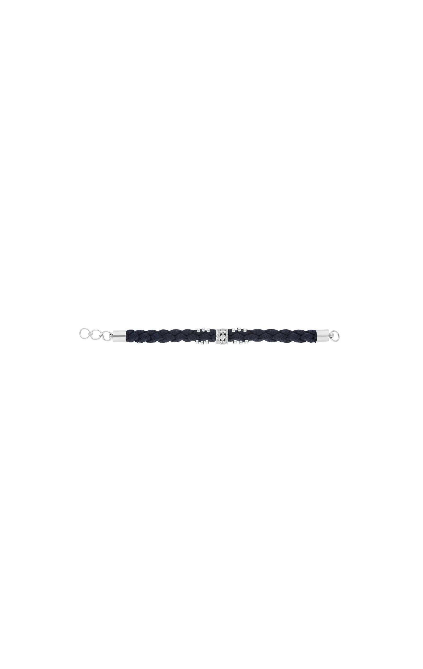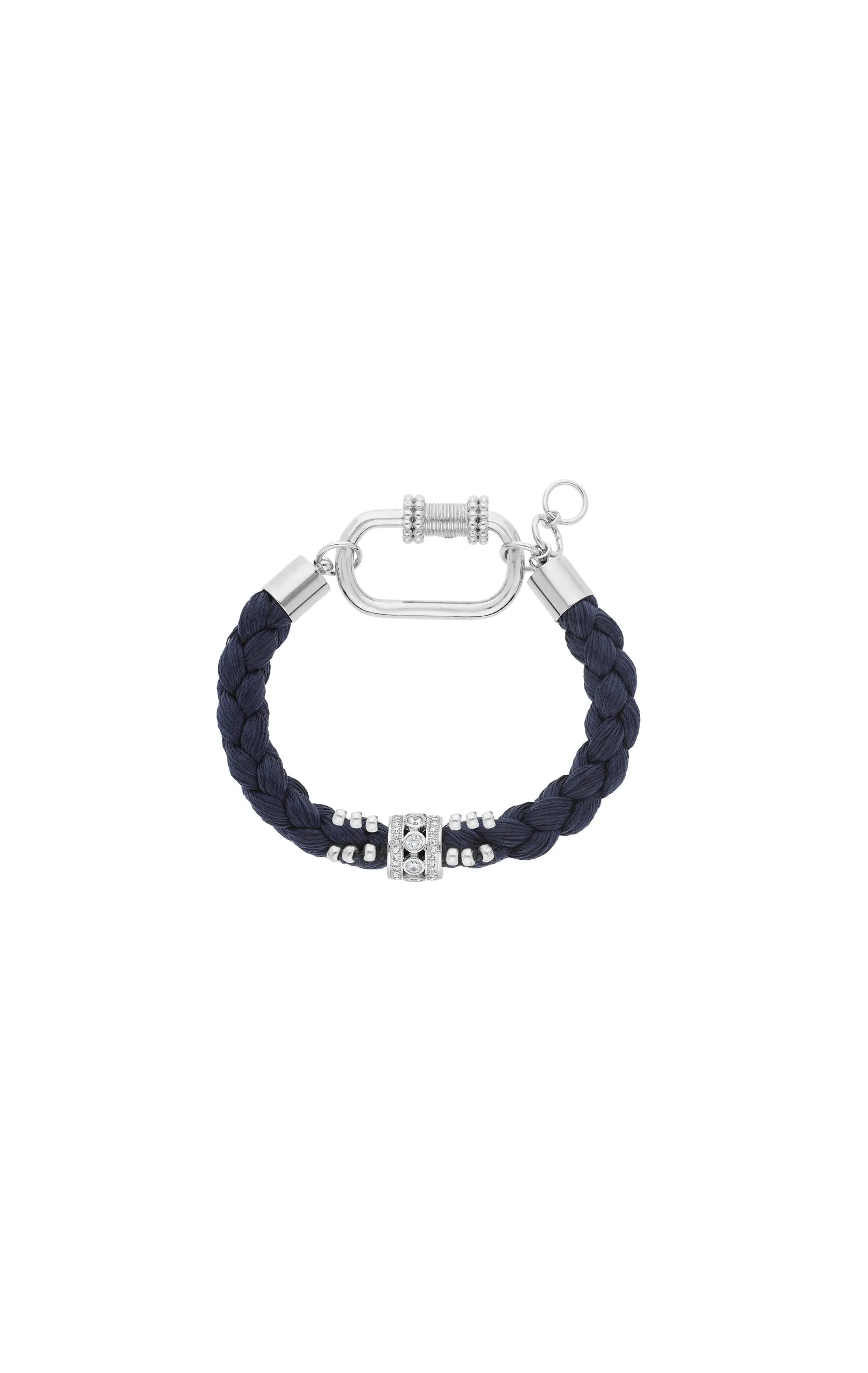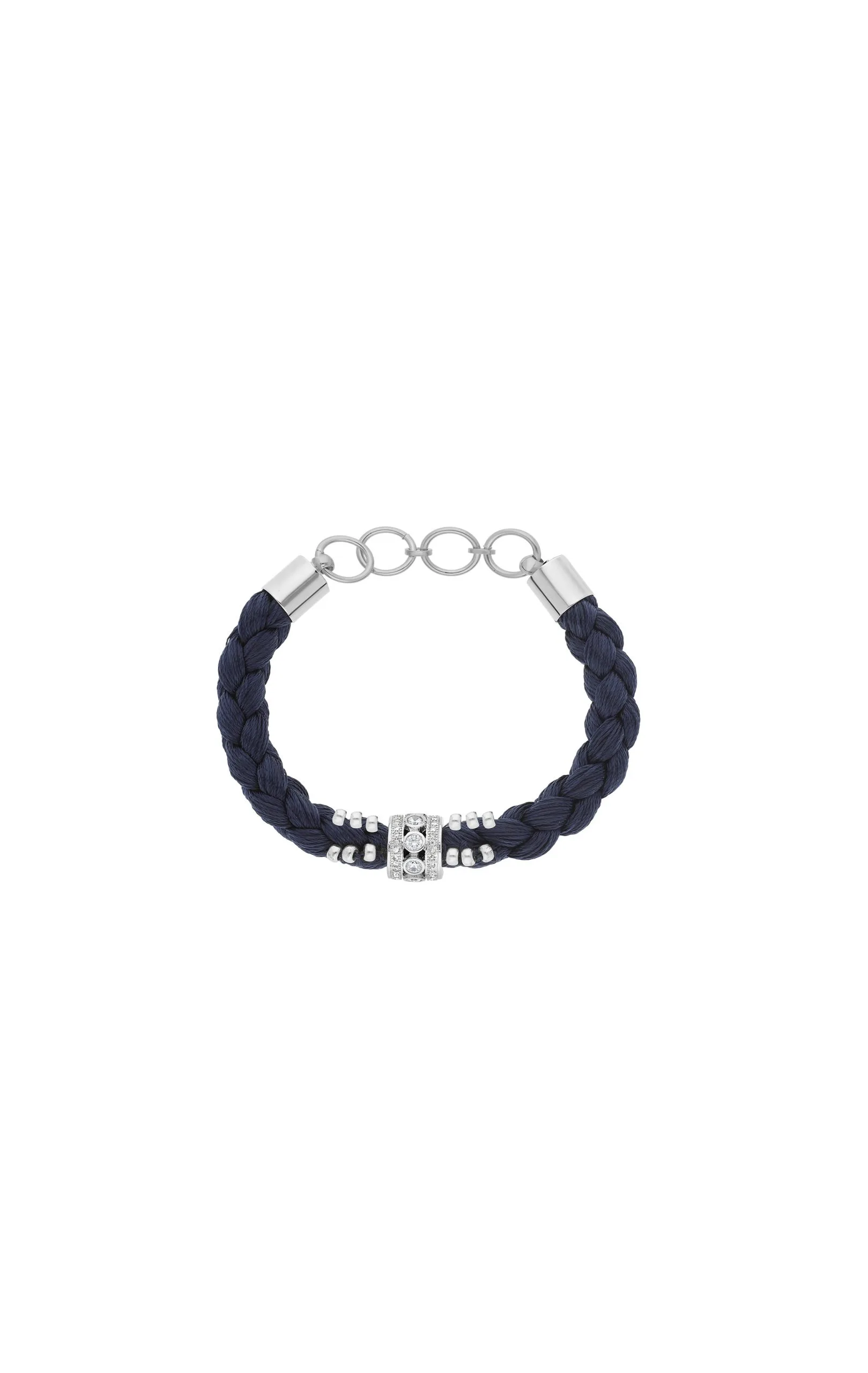 Lien argenté composé d’une large tresse de fil bleu marine avec en son centre un anneau argenté, pavé de trass effet diamant et emmanché sur la tresse. La tresse est ornée de douze petites perles argentées cousues. À associer avec les fermoirs « LOCKETS ».