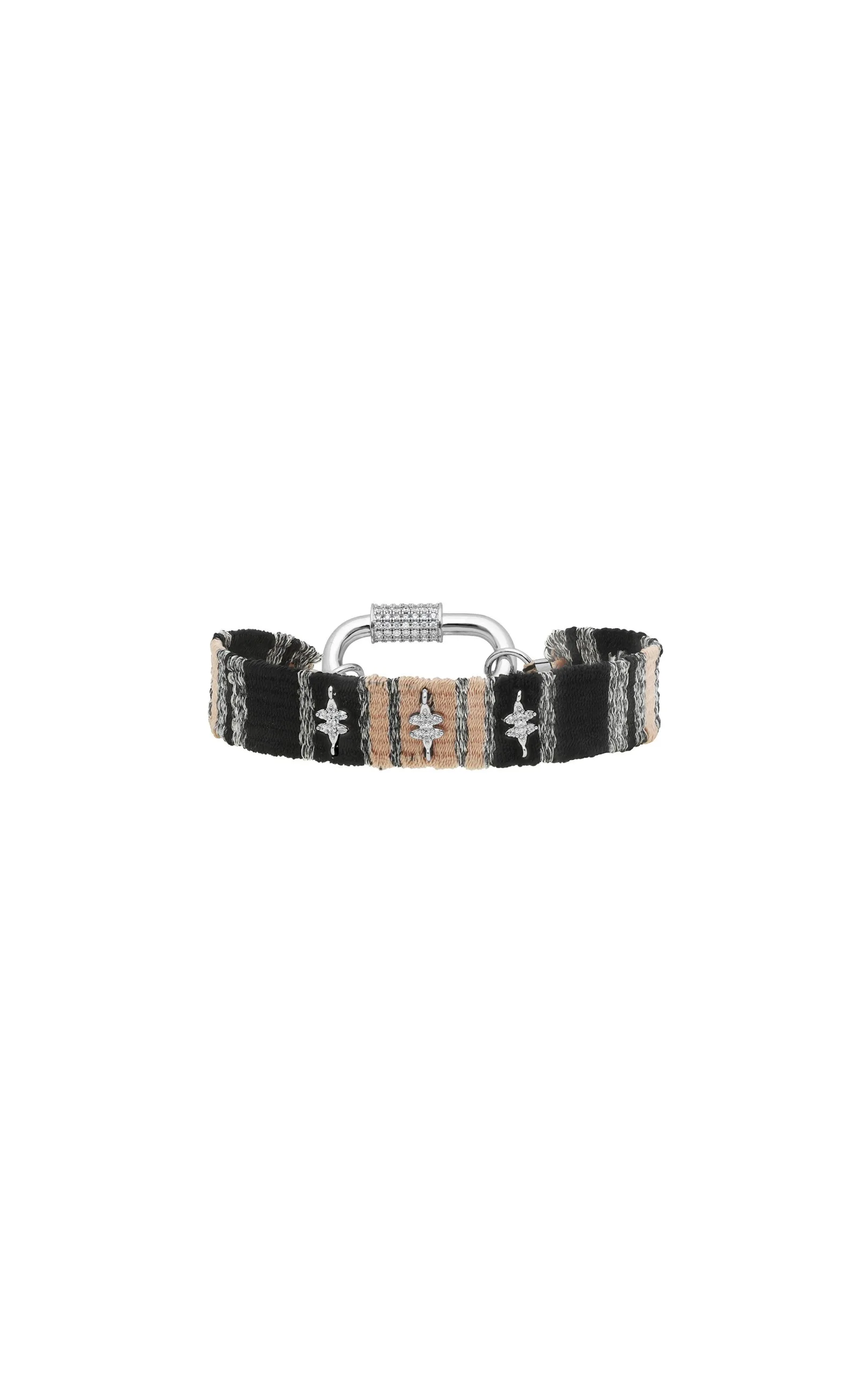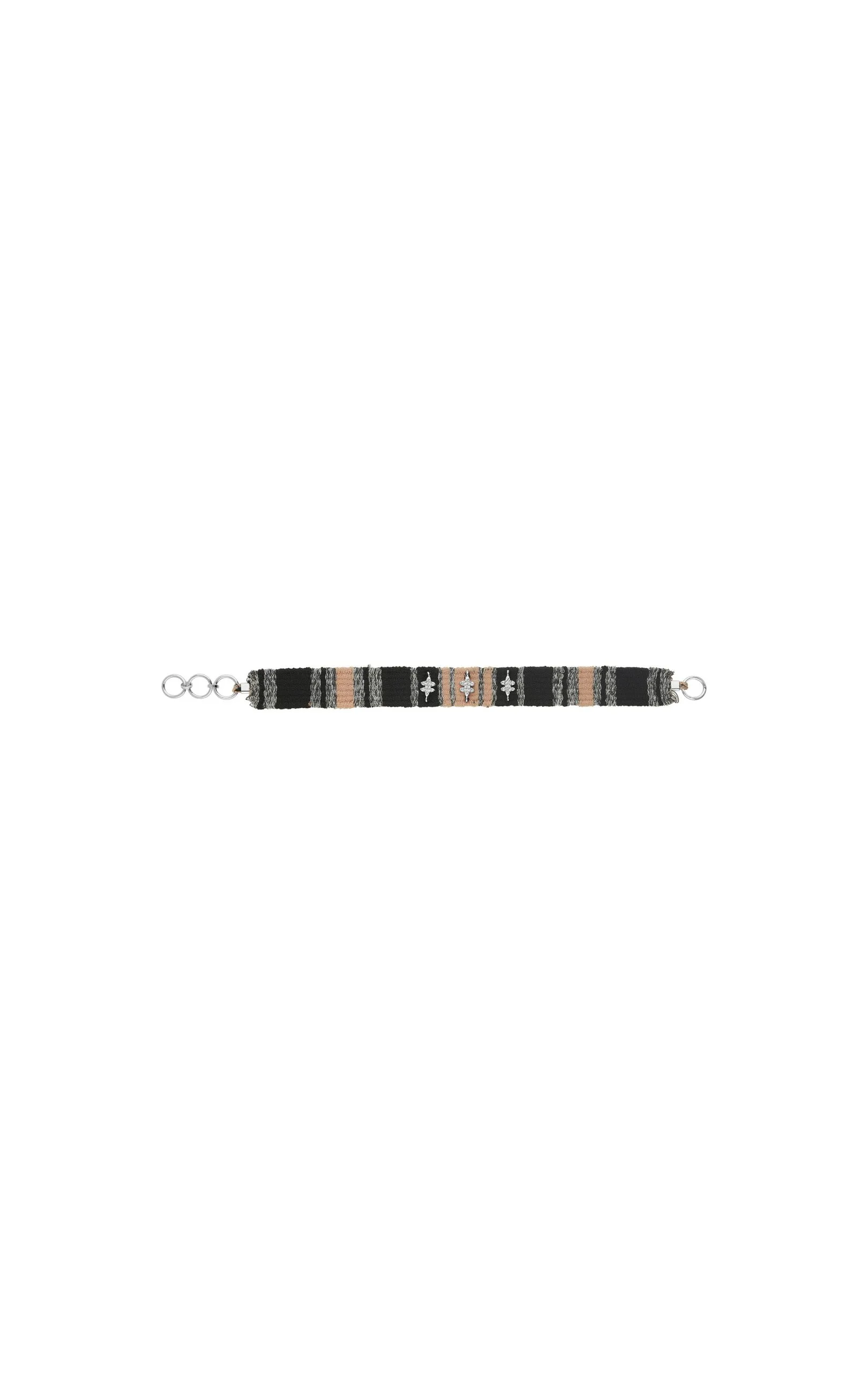 Lien entièrement tissé à la main de fil très fin de couleur noir, rose nude et argenté. Décoré de trois pampilles argentées en son centre, pavées de strass effet diamant. À associer avec les fermoirs « LOCKETS ».