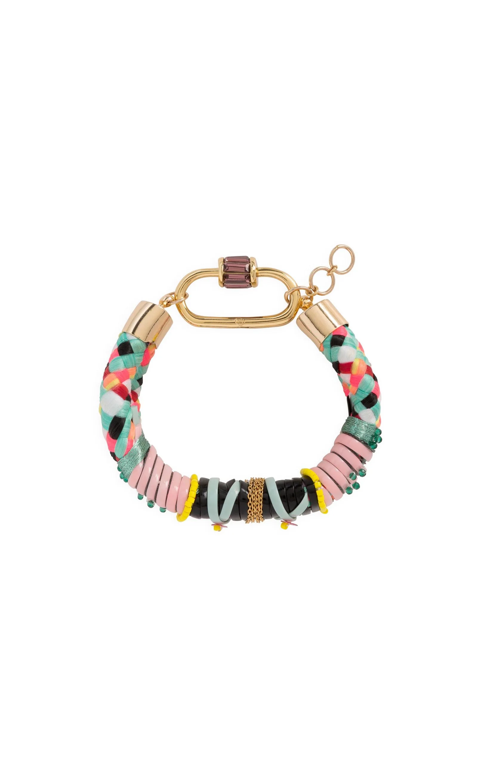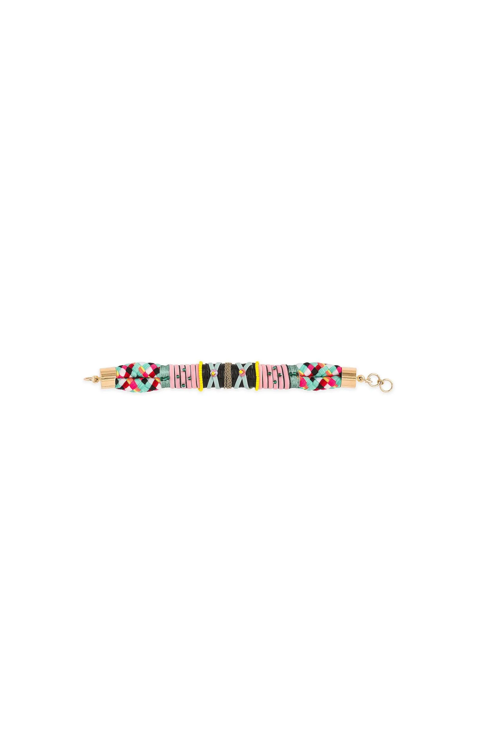 Les liens « JAYNEE » sont les bracelets-cordes épais. Monté sur une double corde multicolore, il est décoré de liens et de scoubidou rose clair, vert, noir, bleu ciel et jaune, ainsi que d’une chaîne dorée à l’or fin 14 carats au centre.