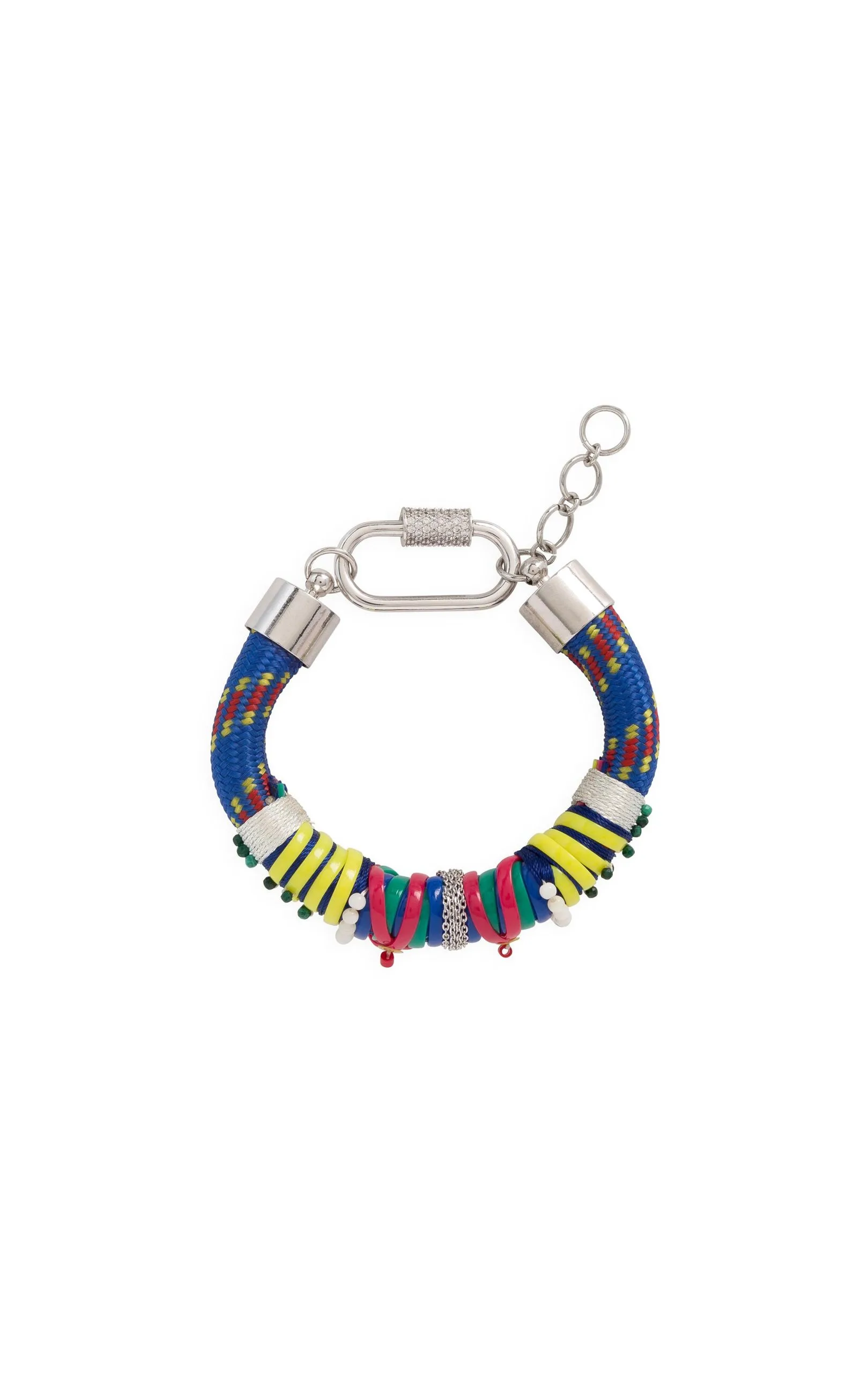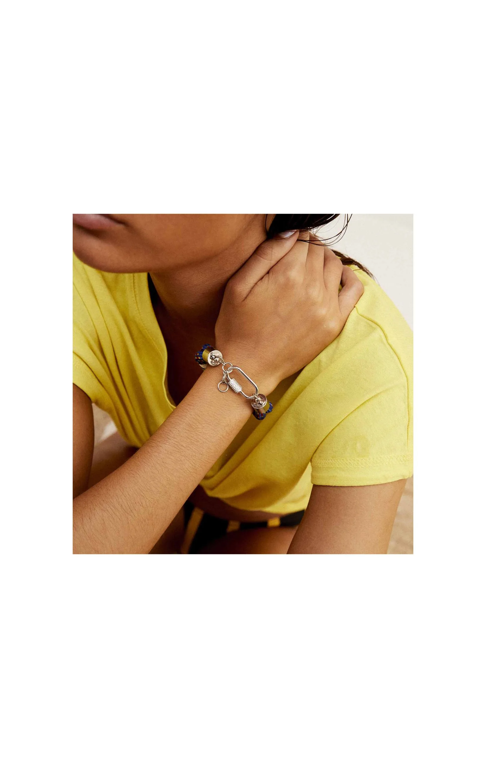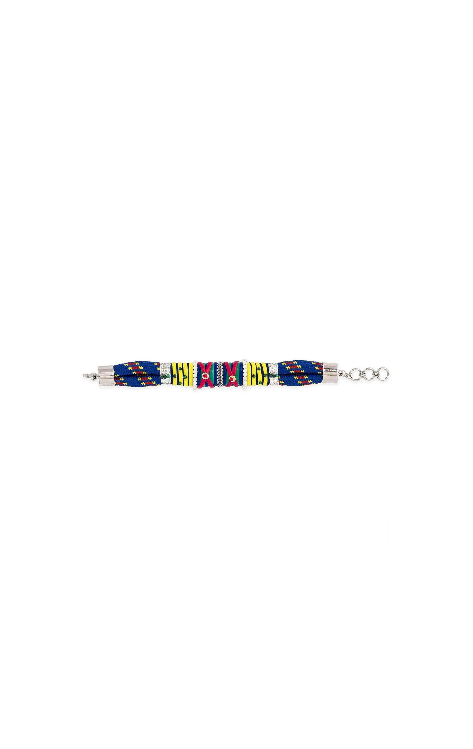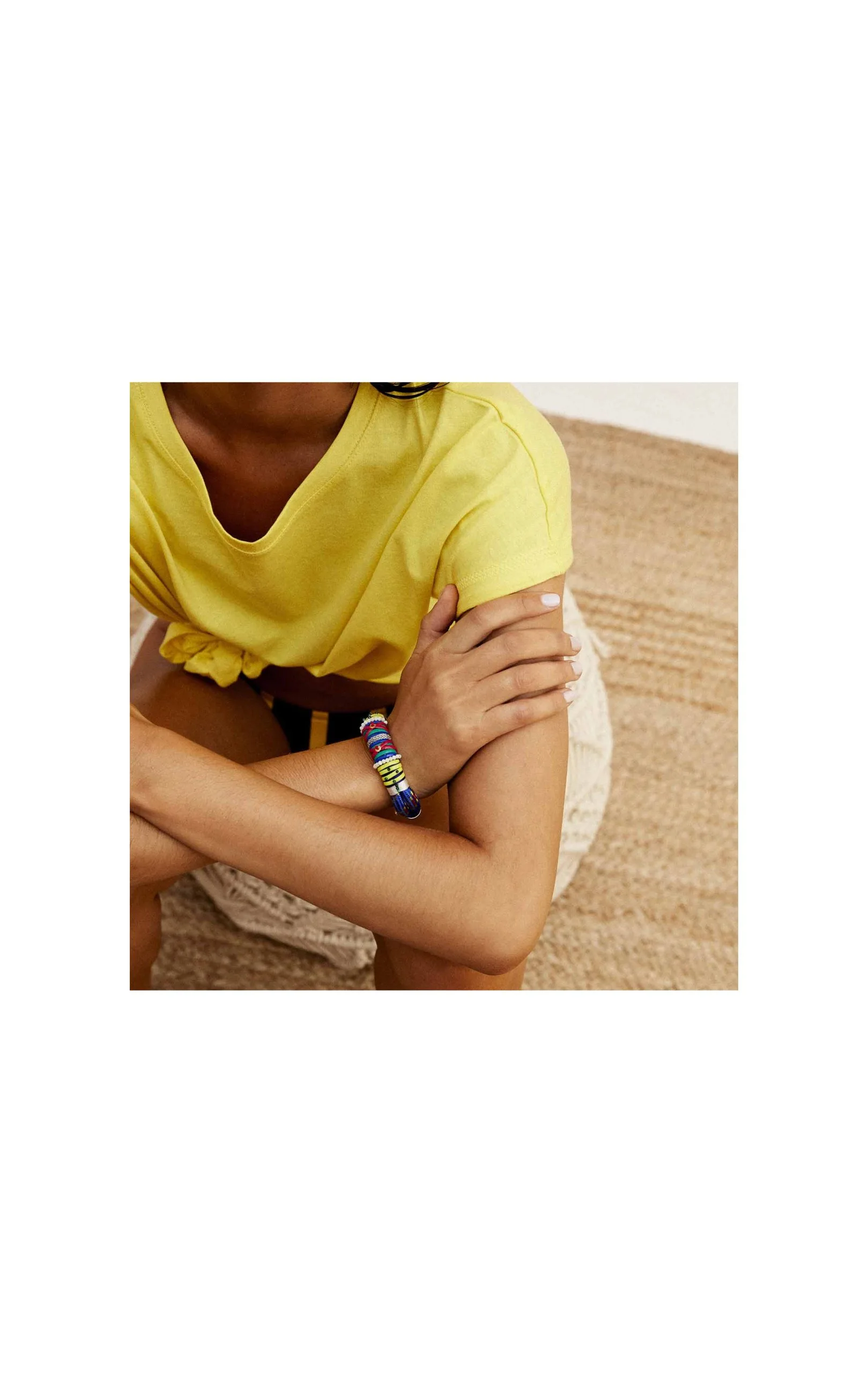Les liens « JAYNEE » sont les bracelets-cordes épais. Monté sur une double corde bleu indigo, rouge et jaune, il est décoré de liens et de scoubidou blanc, jaune fluo et rouge, ainsi que d’une chaîne argentée plaquée au rhodium au centre.