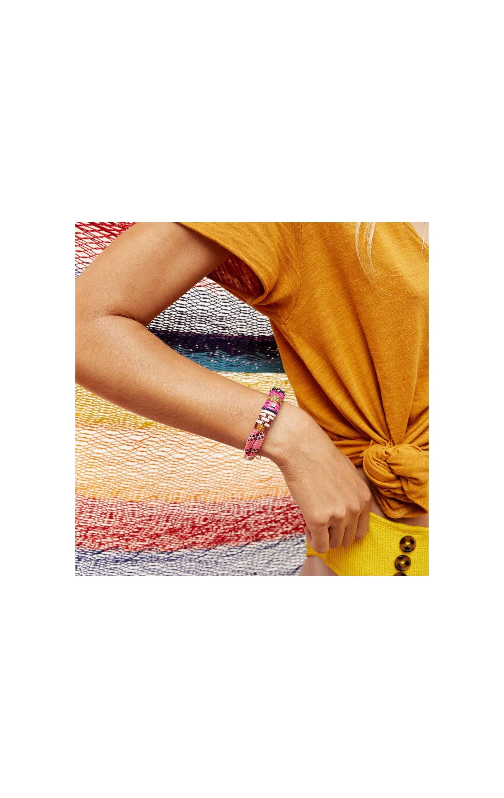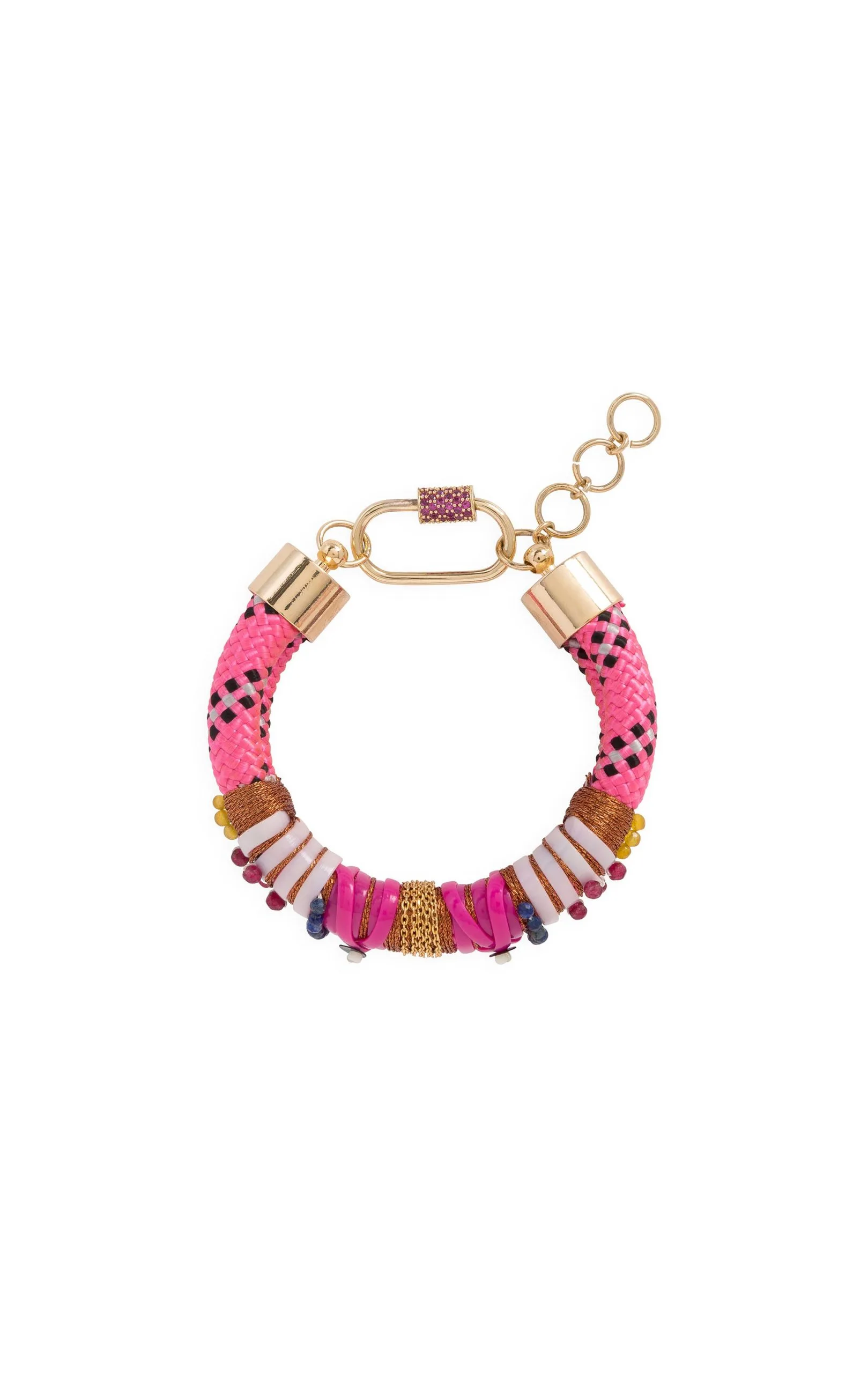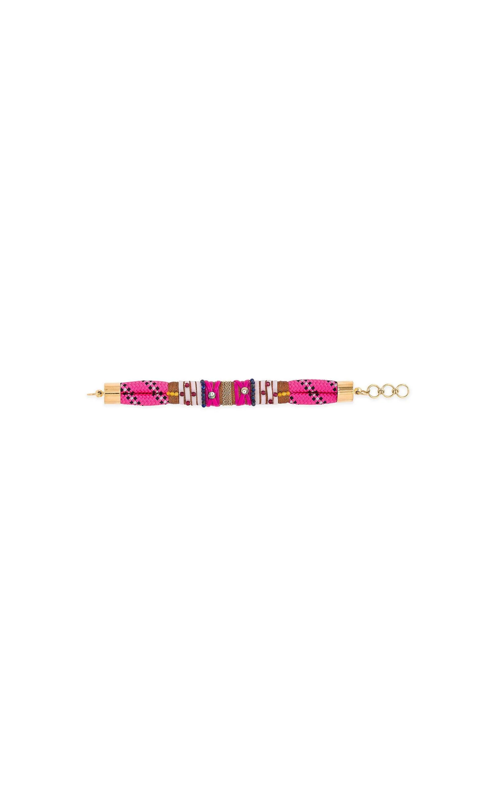 Les liens « JAYNEE » sont les bracelets-cordes épais. Monté sur une double corde rose fluo et bleu indigo, il est décoré de liens et de scoubidou blanc, bordeaux et fuschia, ainsi que d’une chaîne dorée à l’or fin 14 carats au centre.