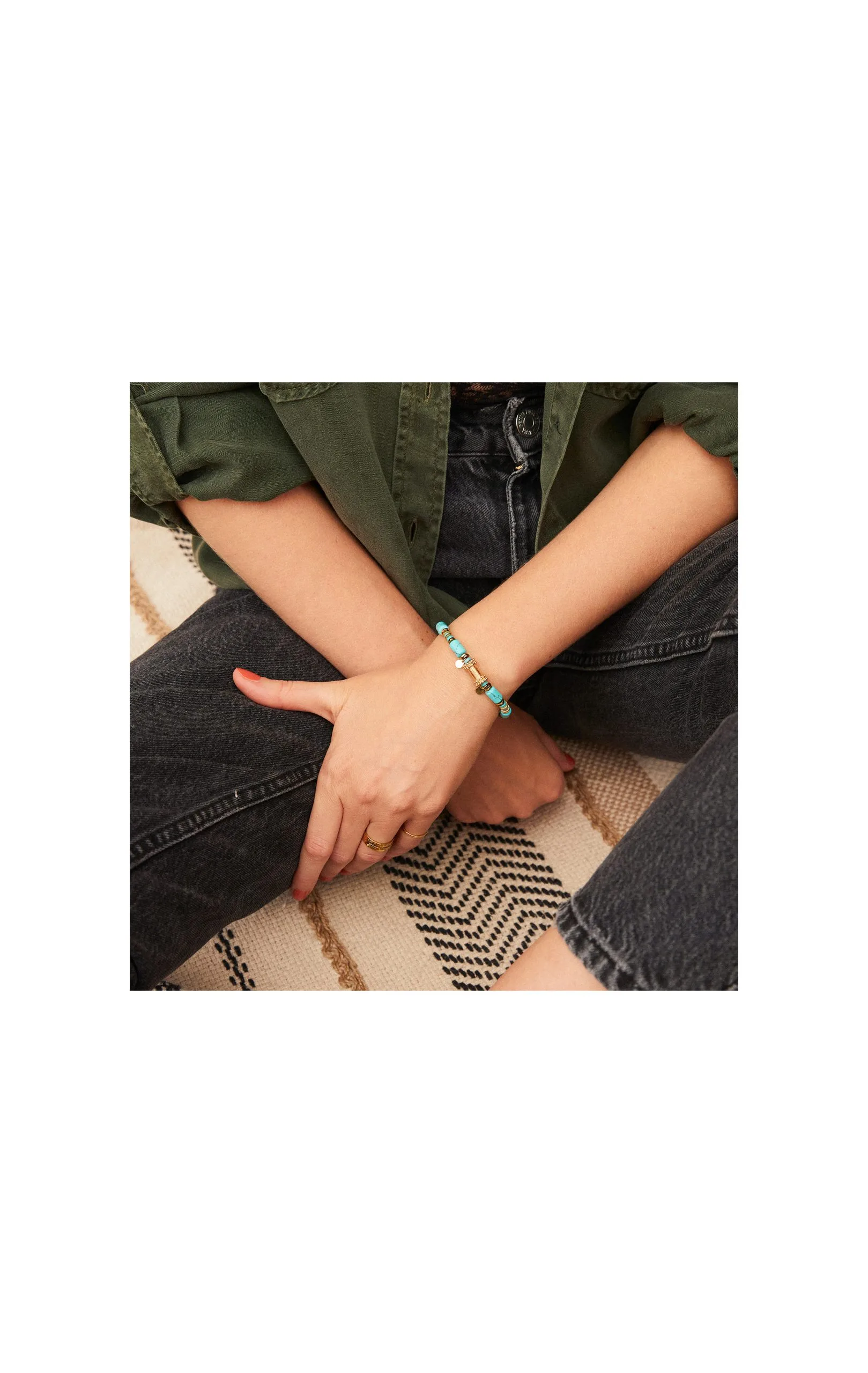 • Perles semi-précieuses: jade, coquillage, hématite, malachite, calcédoine, quartz, agate teintée, turquoise blanche et bleue reconstituée, rhodochrosite, jaspe rouge, lapis lazuli, oeil de tigre. Rondelles silicone. Pampilles centrales émaillées.