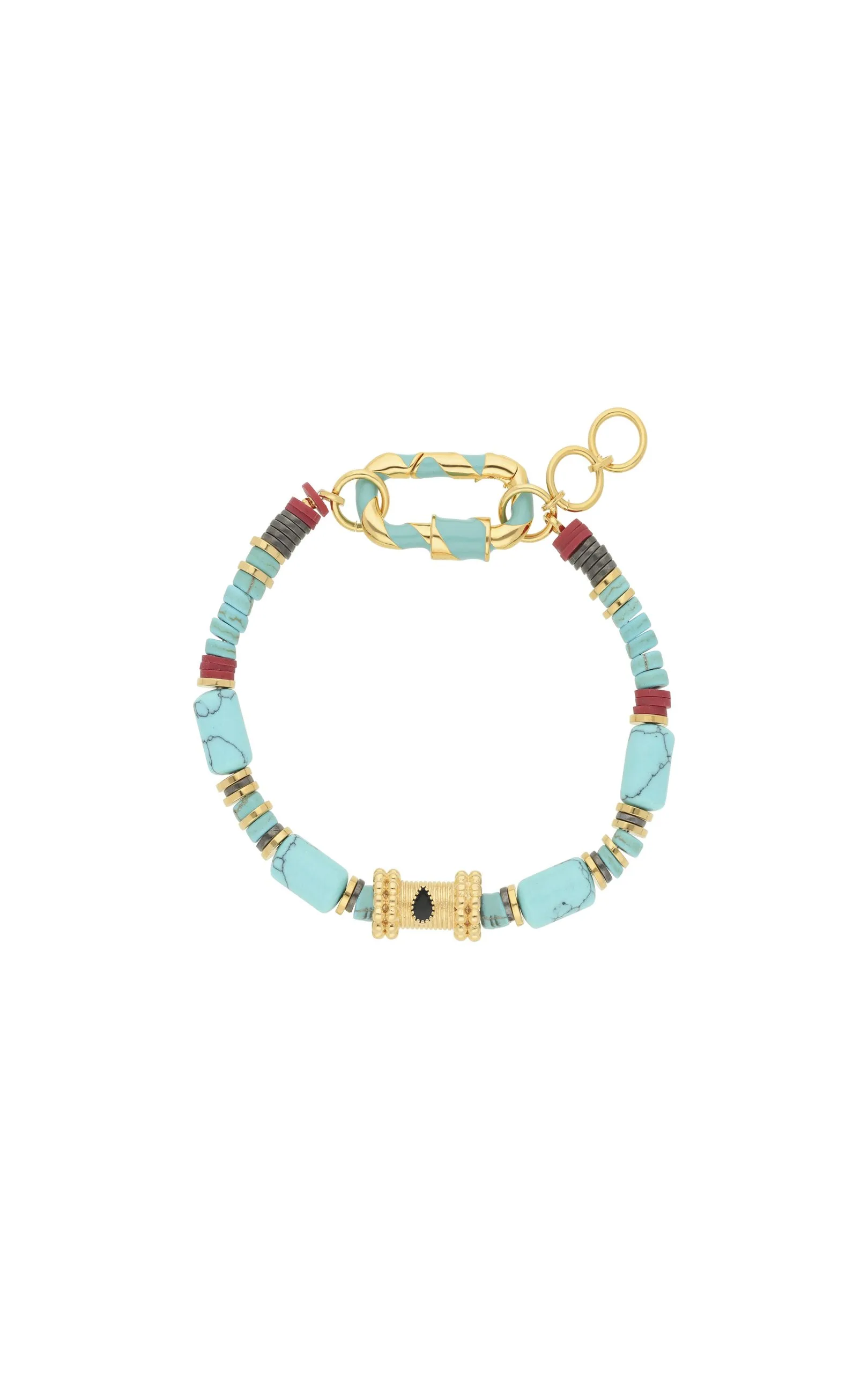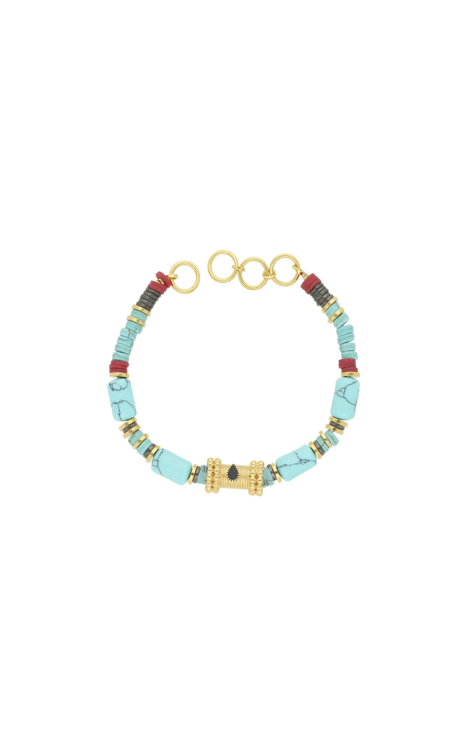 Ce lien doré est composé de pierres véritables semi-précieuses en turquoise recomposée, de perles hématite, de disques en silicone bordeaux et de pampilles dorées à l’or fin 14 carats. Le cabochon central est orné d’une goutte noire effet onyx. À associer avec les fermoirs « LOCKETS ».