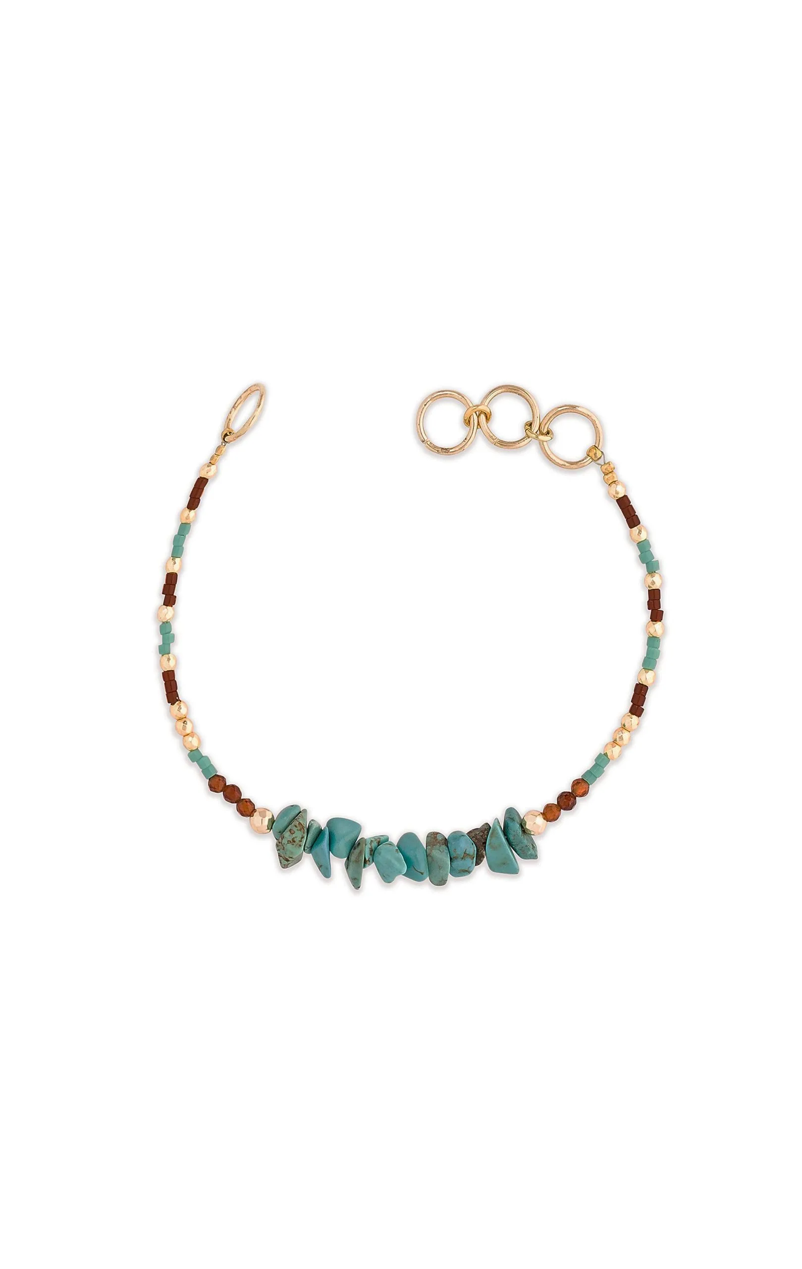 Les bracelets « LEE » sont les liens en chaîne. Ici vous est présenté une composition de petites perles turquoise, ambre, bordeaux et or, et de turquoises naturelles irrégulières en son centre.