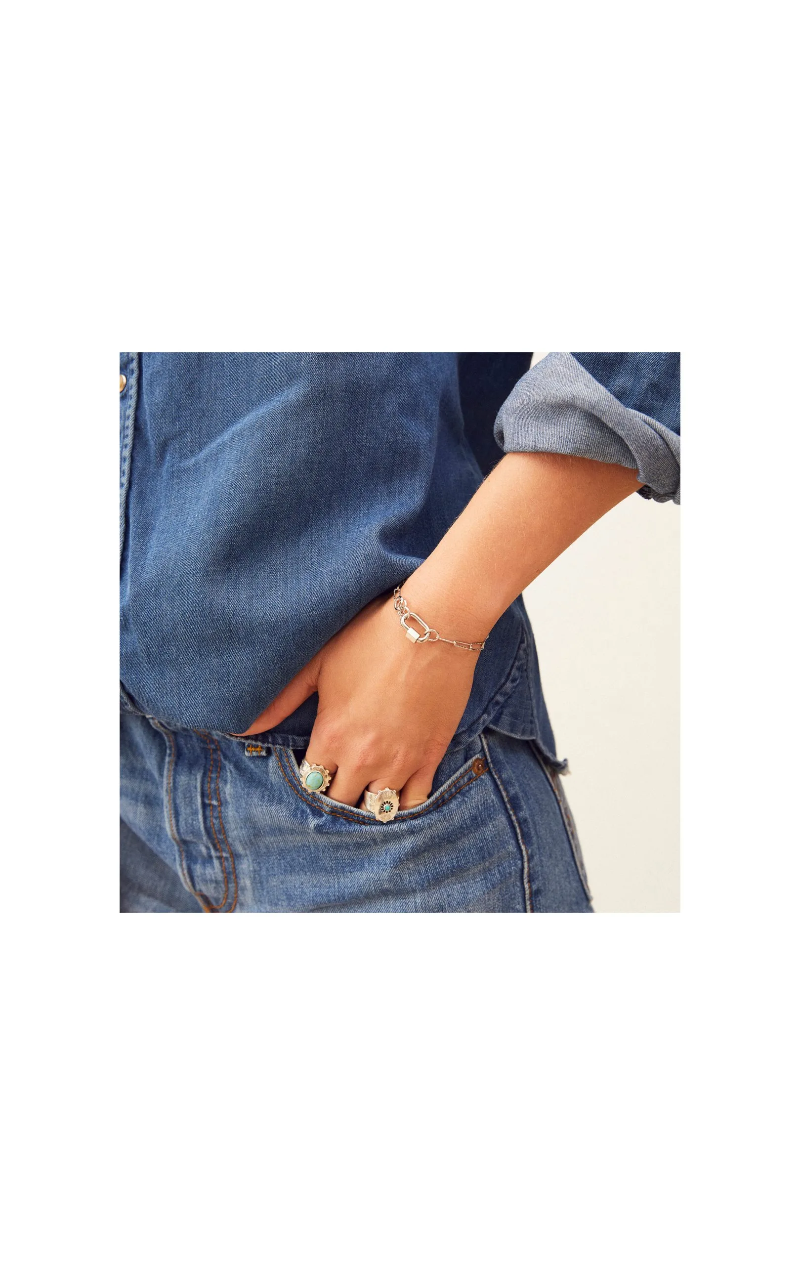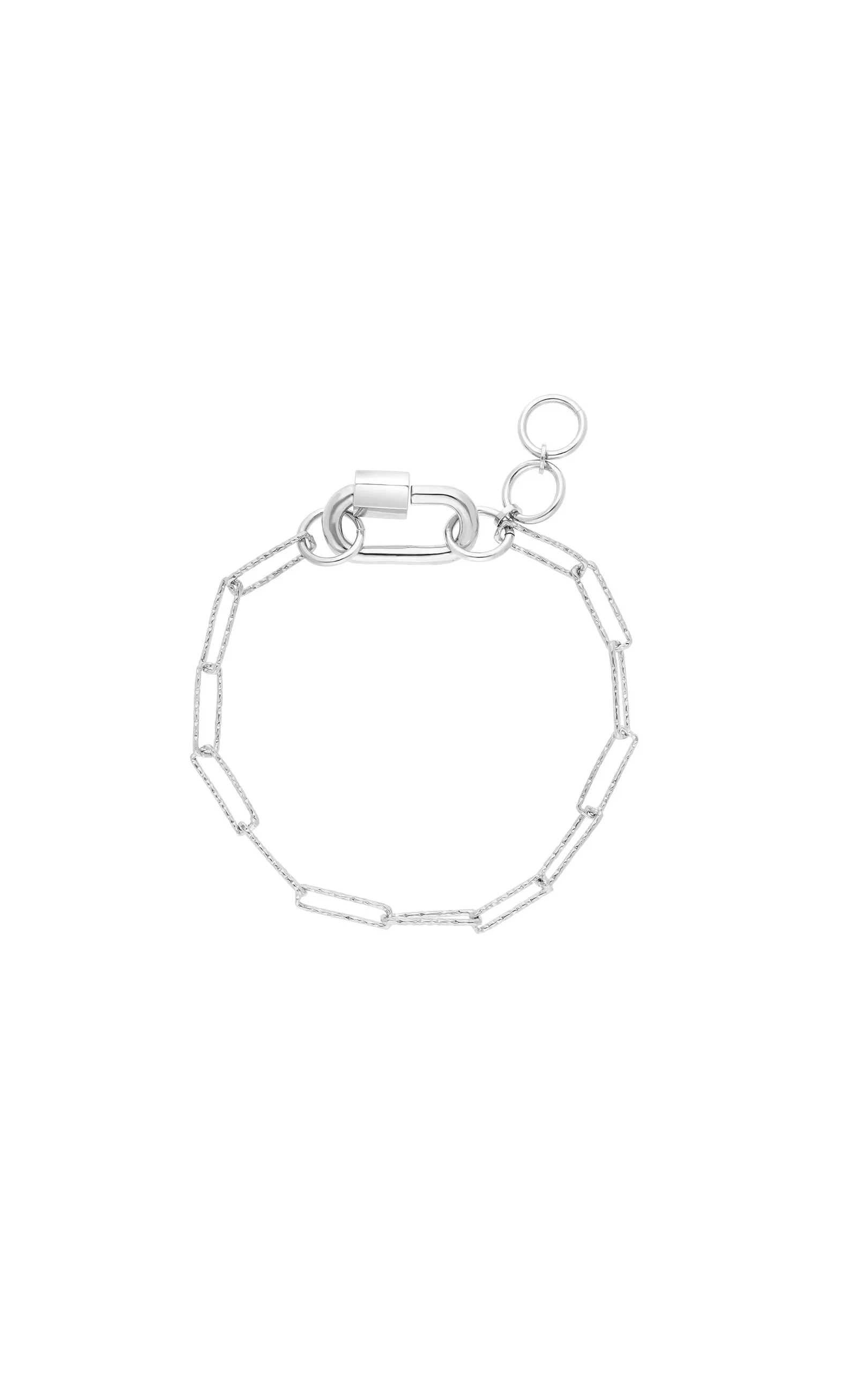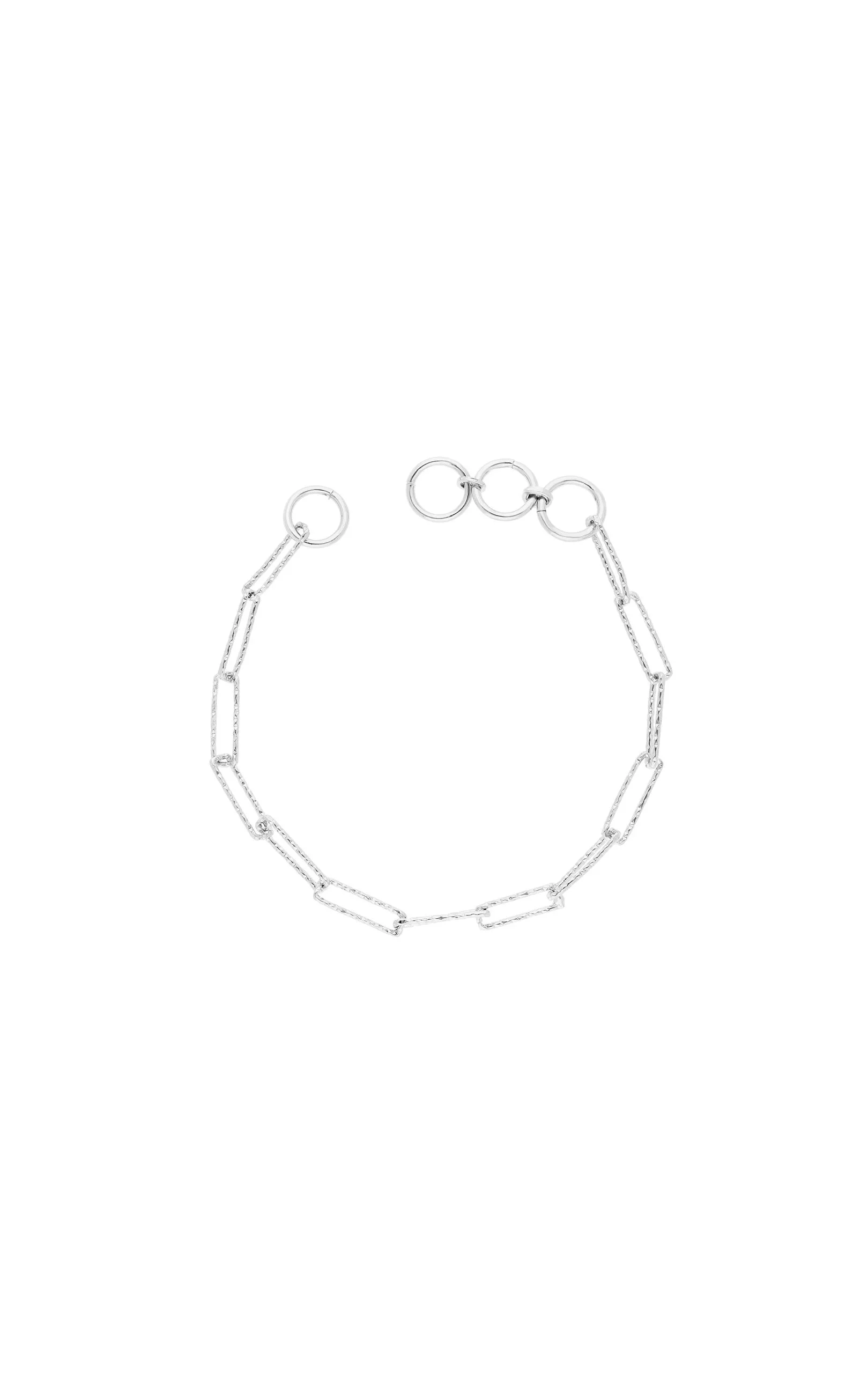 Les bracelets « LEE » sont les liens en chaîne. Ici vous est présentée une chaîne argentée très fine à maillons rectangulaires martelés. À associer avec les fermoirs « LOCKETS ».