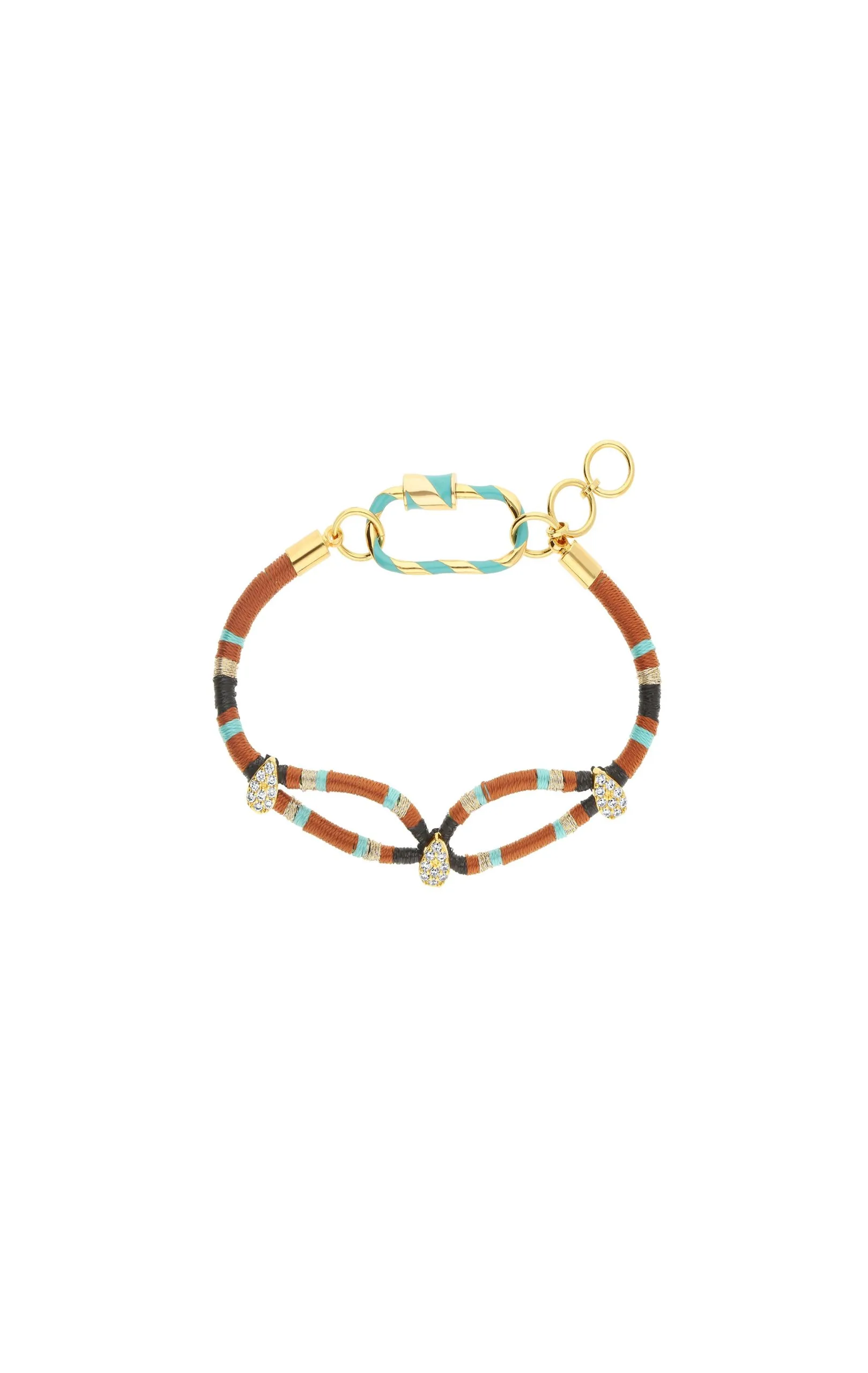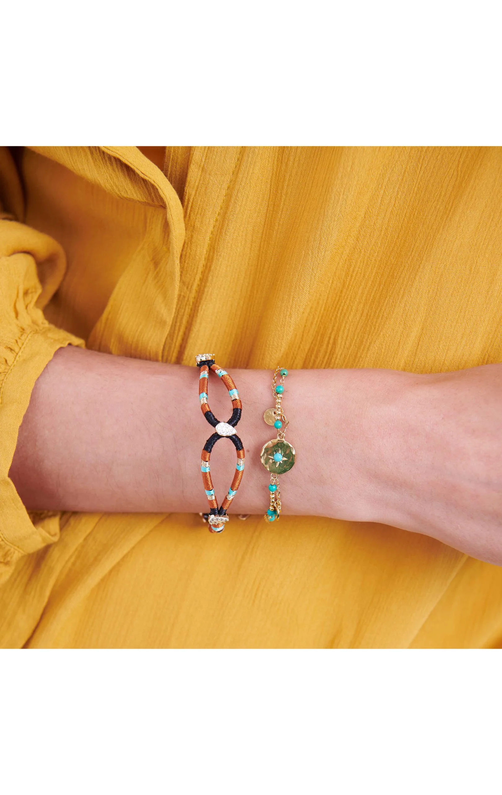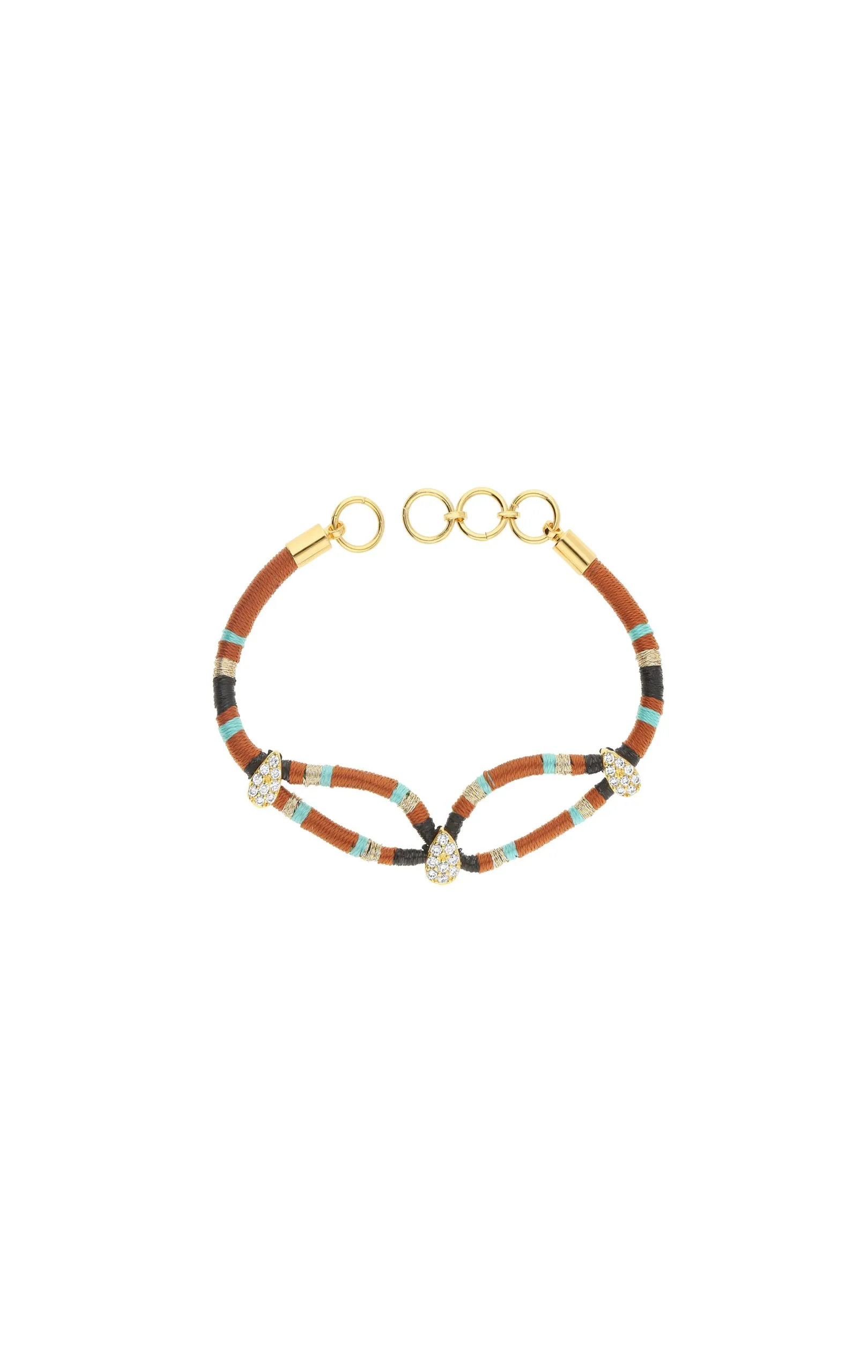 Lien doré tressé de fil coloré dans les tons marron capuccino, rouille, bleu turquoise, doré et noir. Orné de trois pampilles goutte dorées pavées de strass effet diamant. À associer avec les fermoirs « LOCKETS ».