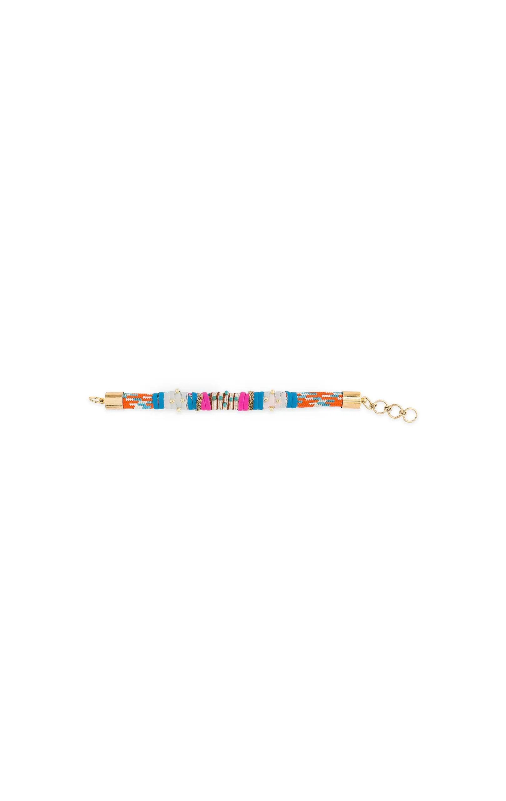 Les liens « MARNY » sont les bracelets-cordes de taille moyenne. Monté sur une corde orange fluo, blanche et bleu turquoise, il est décoré de liens et de scoubidou blanc, bleu, et rose fluo.