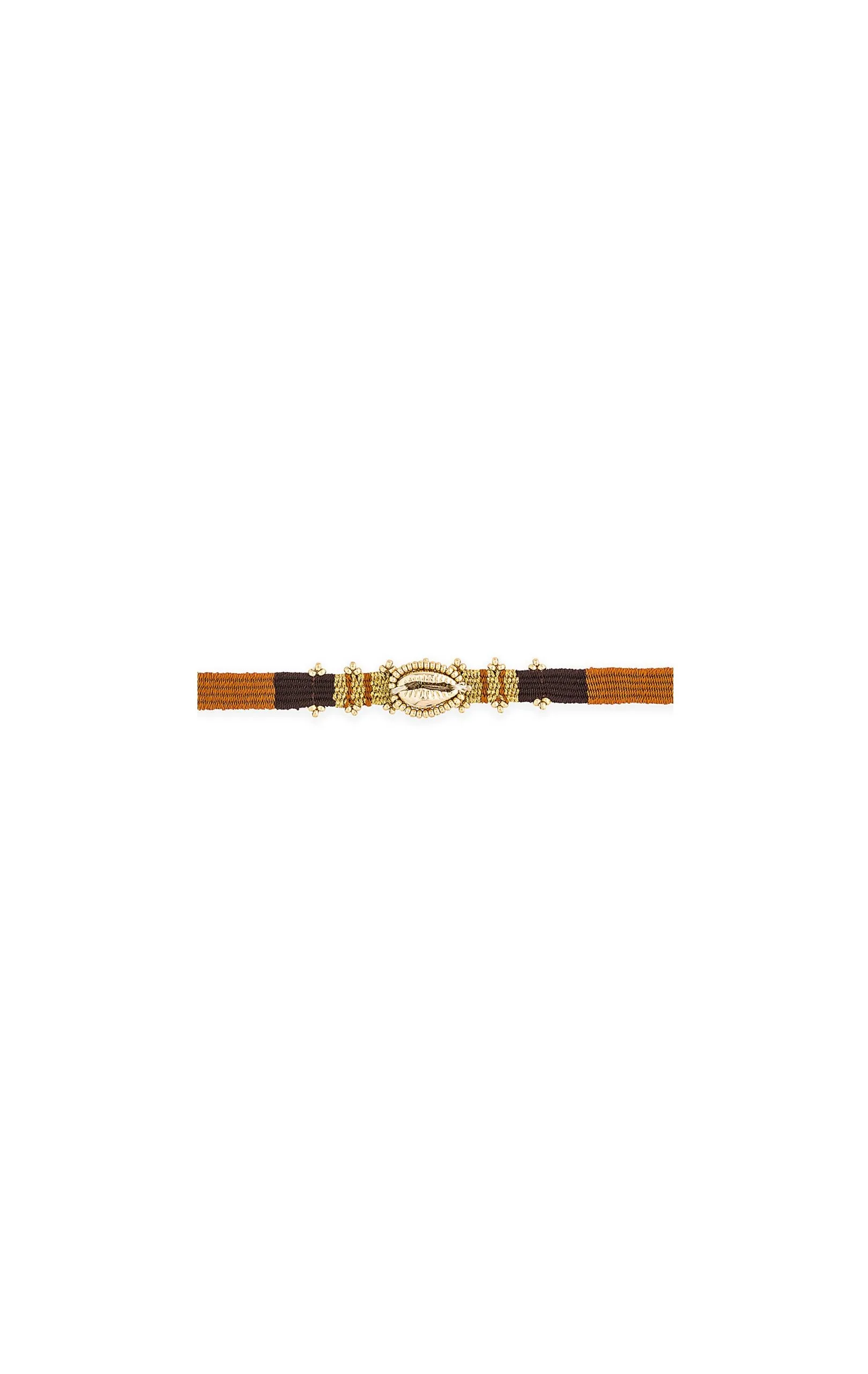 Les bracelets « MOISE » sont les liens tissés en coton et fil doré lurex, décorés en leur centre d’un coquillage cowrie lui-même rebrodé de petites perles. Ici vous est présenté une composition dans les tons rouille, caramel, noir et doré.