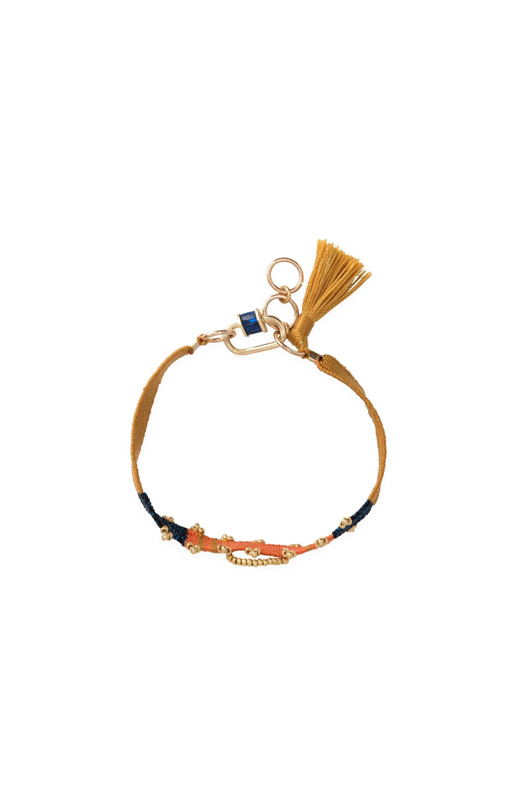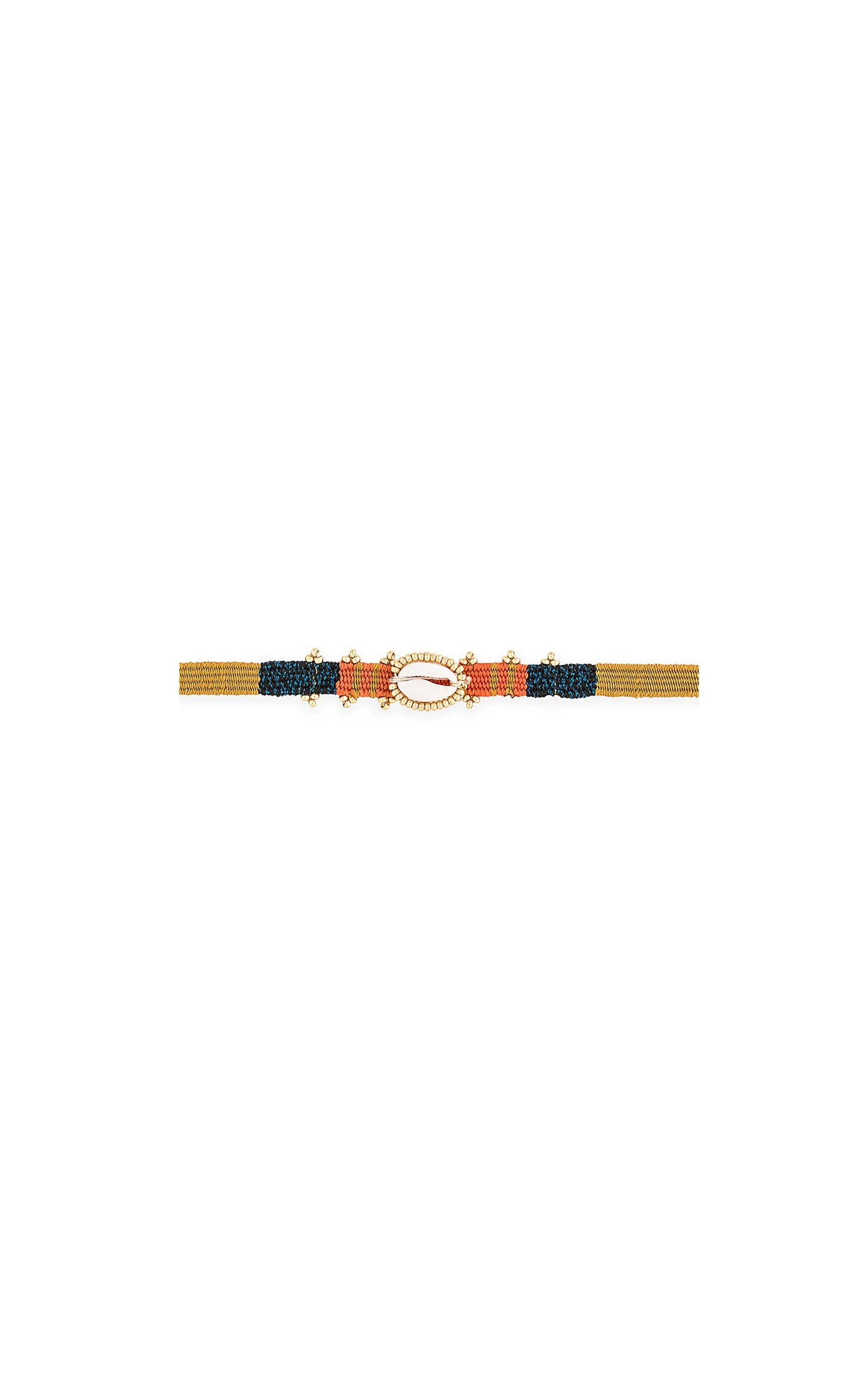 Les bracelets « MOISE » sont les liens tissés en coton et fil argenté lurex, décorés en leur centre d’un coquillage cowrie lui-même rebrodé de petites perles. Ici vous est présenté une composition dans les tons caramel, bleu marine irisé, rose corail et doré.