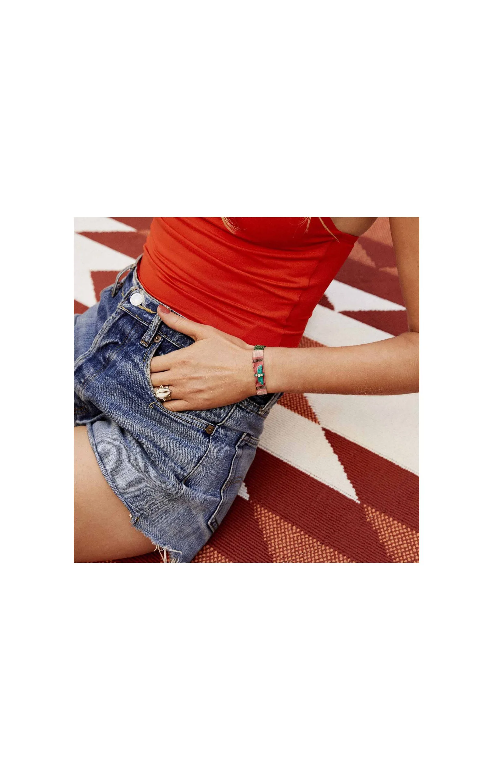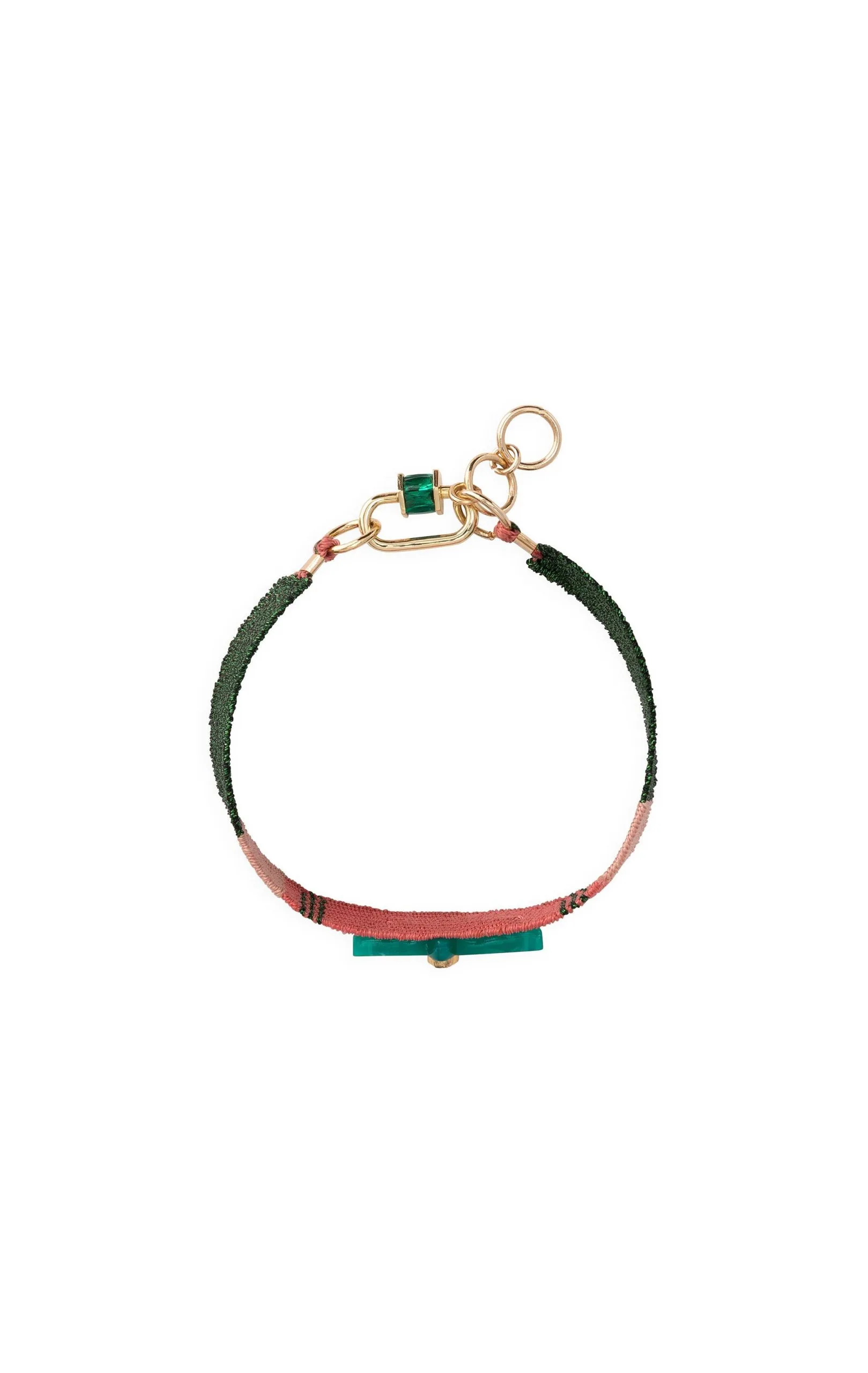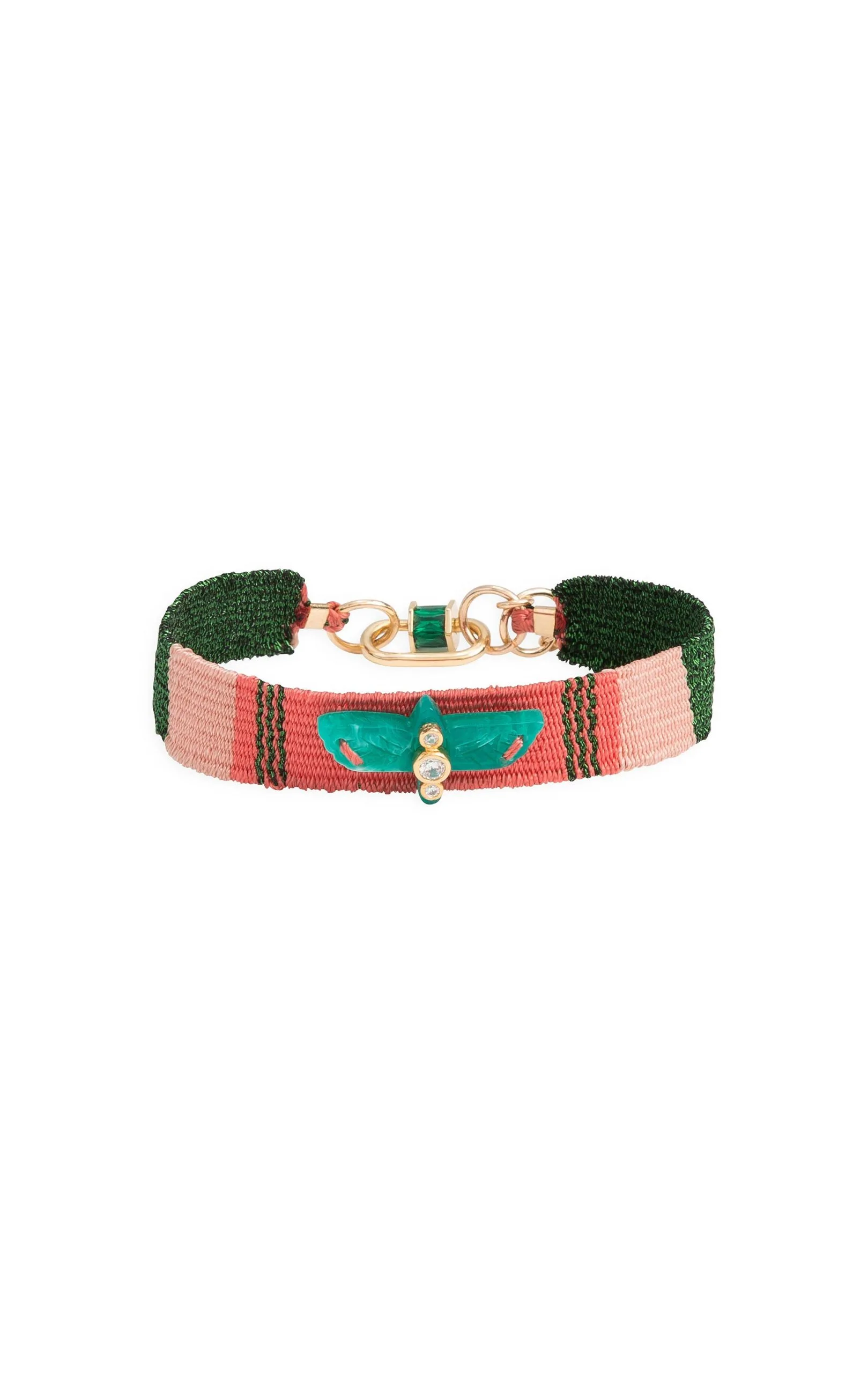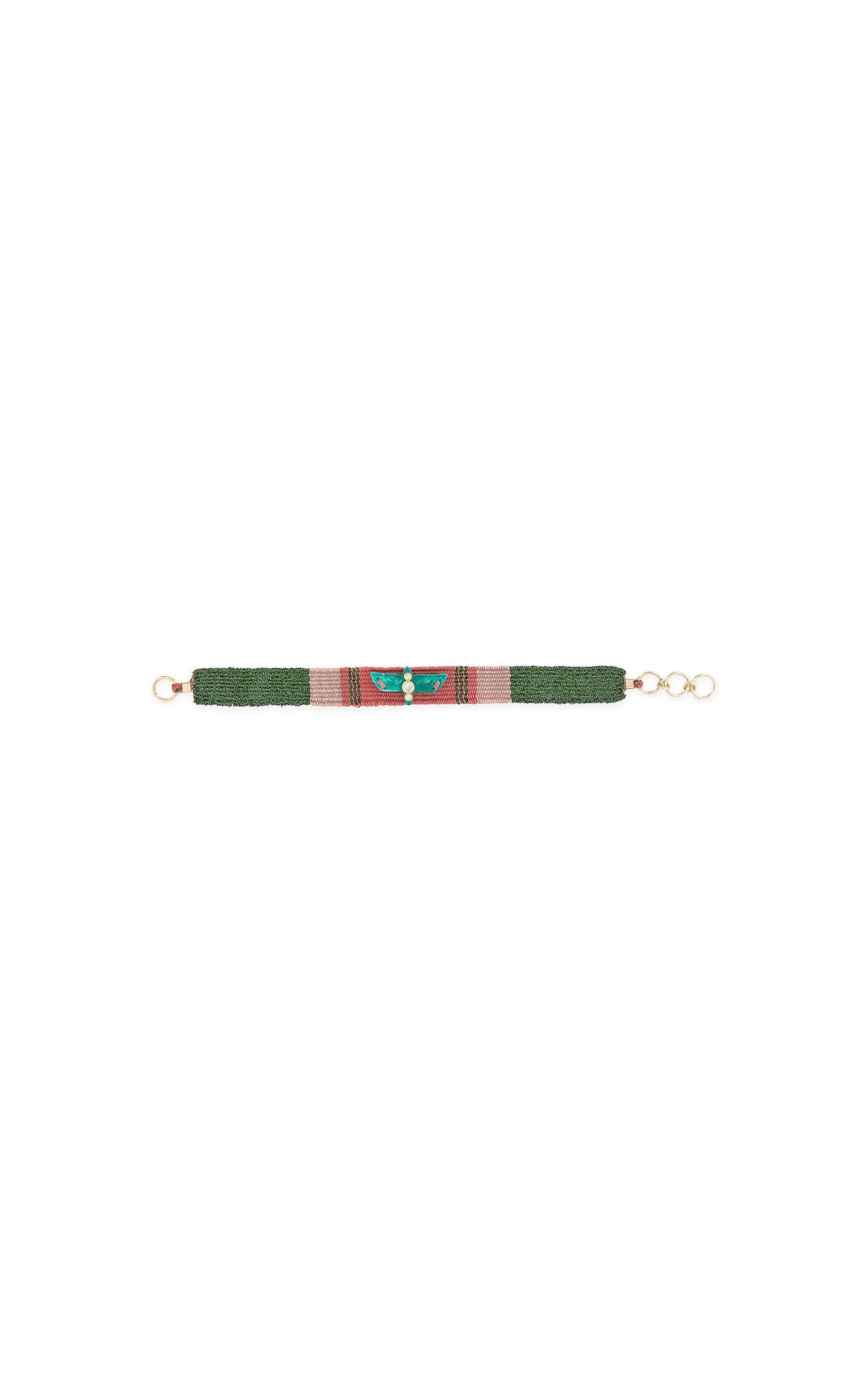 Les bracelets « NOE » sont les liens tissés en coton et fil argenté lurex, décorés en leur centre d’un aigle lui-même orné de trois cristaux effet diamant. Ici vous est présenté une composition dans les tons vert irisé, rose nude et corail avec un aigle couleur vert malachite.