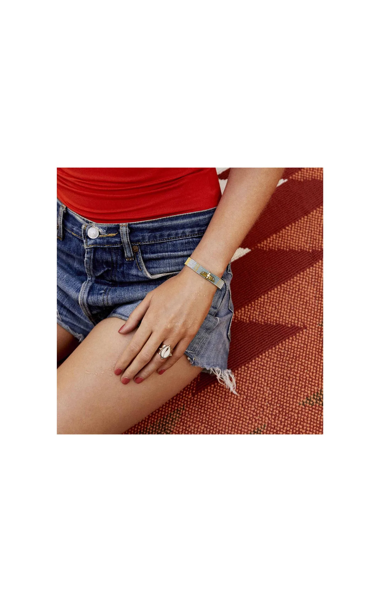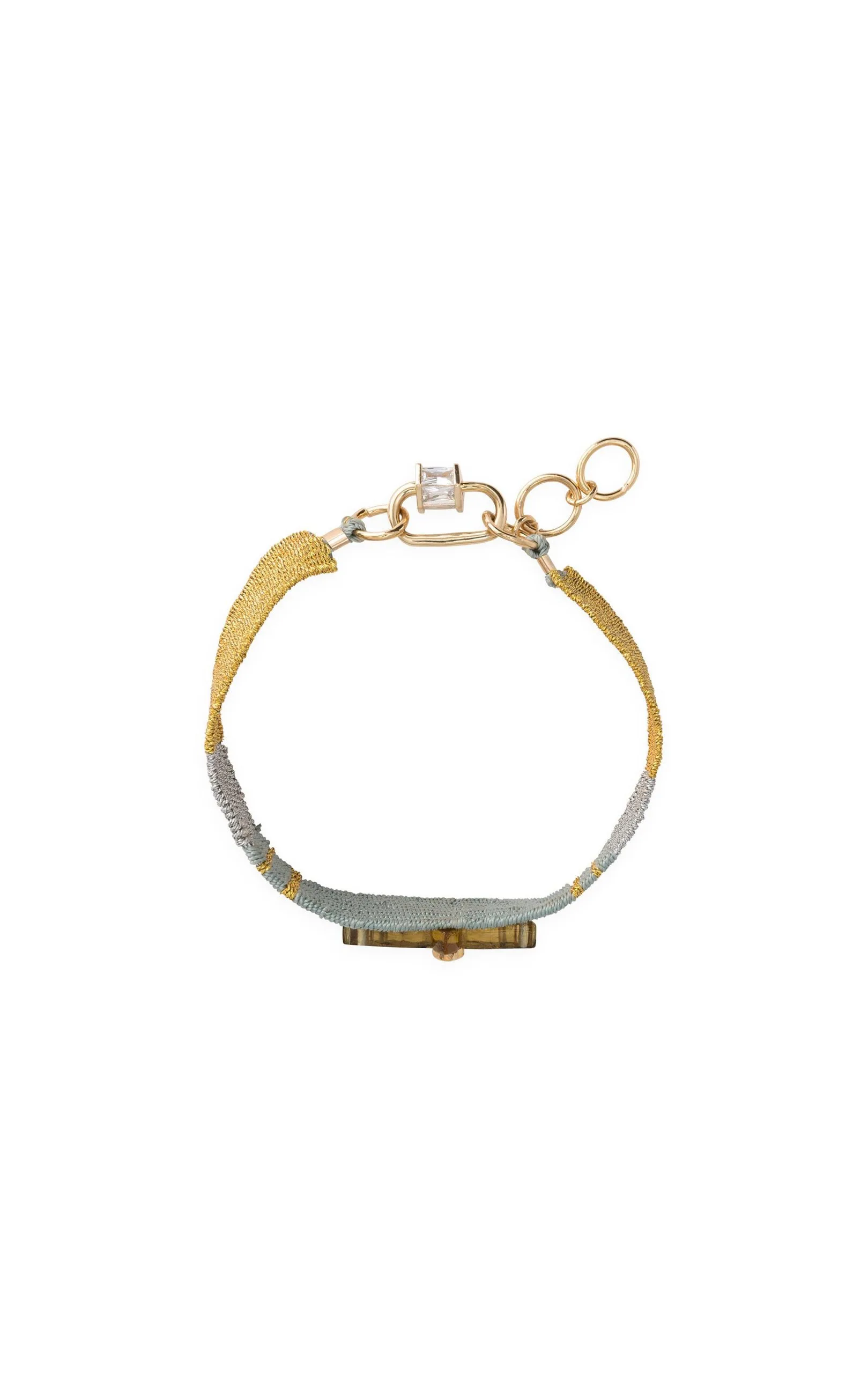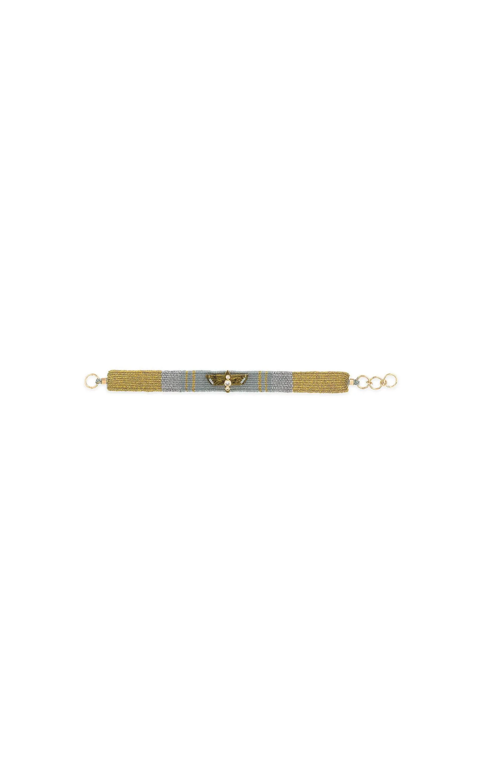 Les bracelets « NOE » sont les liens tissés en coton et fil argenté lurex, décorés en leur centre d’un aigle lui-même orné de trois cristaux effet diamant. Ici vous est présenté une composition dans les tons doré, argent et bleu celadon avec un aigle couleur topaze ambre.